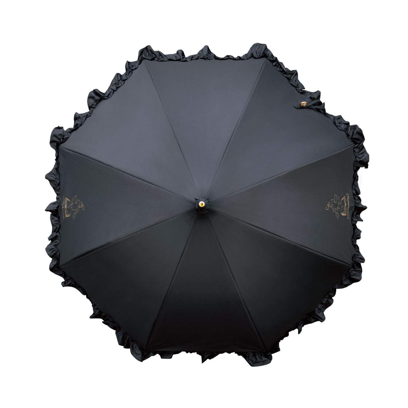 外側は黒一色の遮光生地に外周はフリルで、「魔法部®」と「Apleberute」のワンポイントロゴプリントが入っている落ち着いたデザイン。傘を開くと内側には、魔法使いの秘密の書斎を描いたオリジナルイラストが全面にプリントされています。本棚にびっしりと並んだ魔導書は圧巻。黒猫やコウモリなどの「使い魔」や、魔法のポーション、異世界へ繋がる扉など、ファンタジー好きにはたまらないモチーフが繊細なタッチで描かれています。傘を広げればあなただけの秘密の書斎が頭上に広がって、まるで異空間を出現させる魔法を使ったような気分になれます。