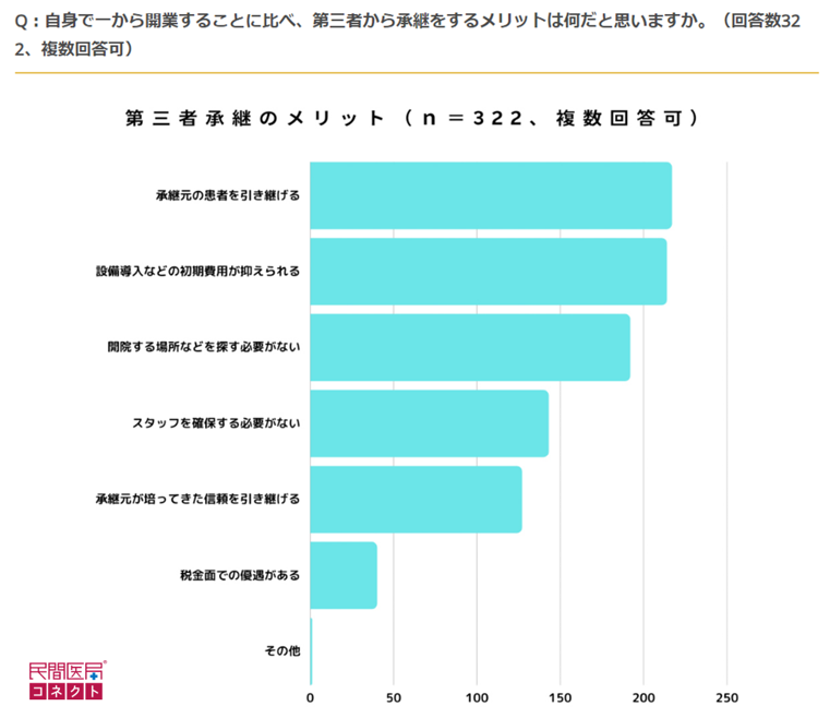自身で一から開業することに比べて、第三者から承継をすることのメリットについても尋ねました(複数回答可)。最も多くの回答を集めたのは「承継元の患者を引き継げる」が217人(67%)で、以下「設備導入などの初期費用が抑えられる」が214人(66%)、「開院する場所などを探す必要がない」が192人(60%)と続きます。また、「スタッフを確保する必要がない」は143人(44%)、「承継元が培ってきた信頼を引き継げる」は127人(39%)、「税金面での優遇がある」は40人(12%)がメリットだと考えていることがわかりました。