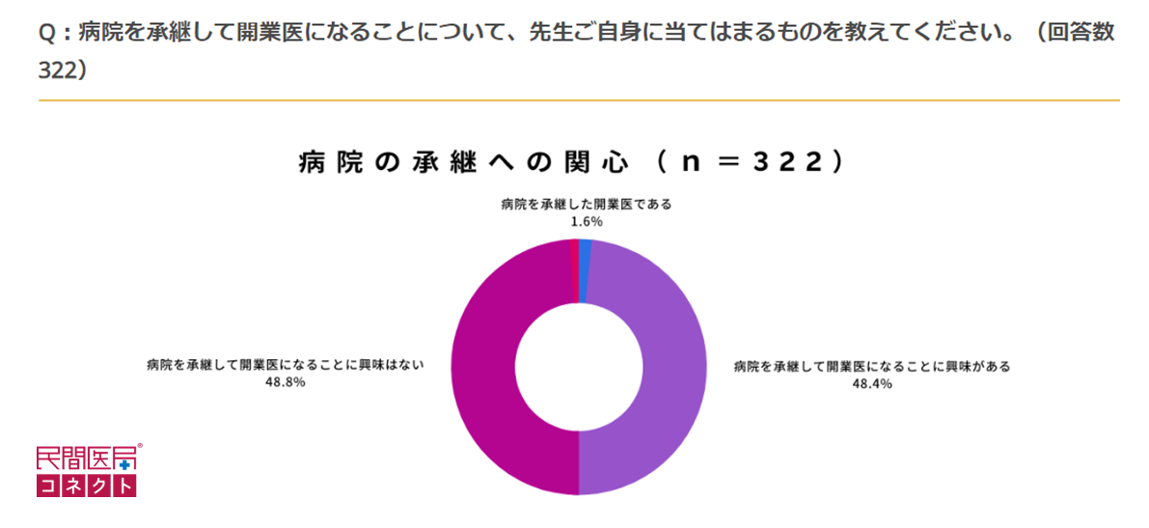 後継者がいない病院を承継して、開業医になる「第三者継承」についての考えを聞きました。「病院を承継して開業医になることに興味がある」は48%、「興味はない」は49%と、回答がほぼ半々に分かれるという結果になりました。