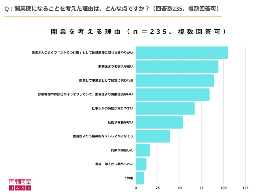 さらに、「診療時間や休診日がはっきりしていて、勤務医より労働環境がいい」と考える人が84人(38%)、「仕事以外の時間が取りやすい」が67人(29%)、「転勤や異動がない」が54人(23%)、「勤務医よりも精神的なストレスが少なそう」が39人(17%)と、開業医になることは、働く環境の面でも魅力的だと考えている人も一定数いました。