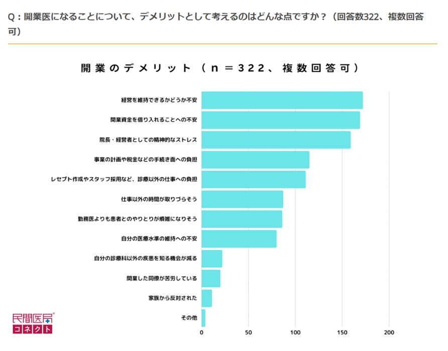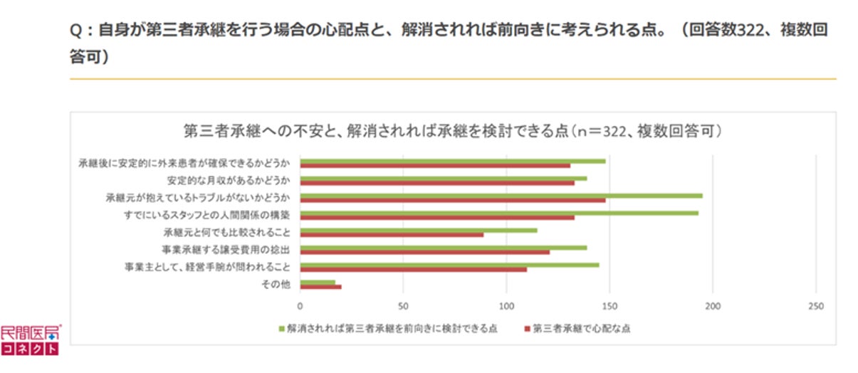 といった回答からは、自身の経営力や経営者として負うべき責任やリスク、患者の確保(集客)について不安に感じている様子がうかがえます。
