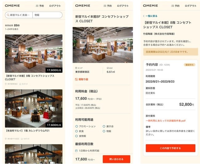 『OMEMIE』とは、マルイ店舗への出店の検討から問い合わせ、契約までの手続きがオンラインで行える出店サービスです。マルイ店舗へのポップアップイベント(短期出店)から、長期の出店までの申し込みが可能です。