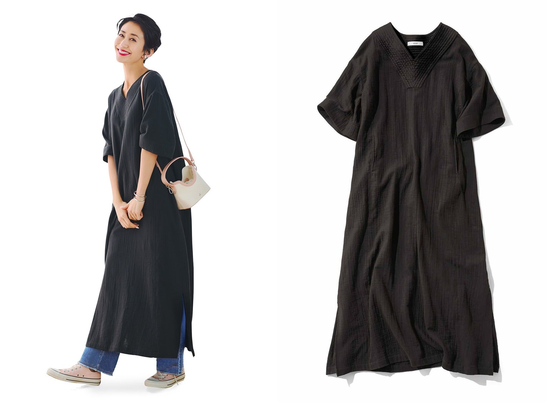 【NEW】IEDIT[イディット] 福田麻琴さんコラボ 綿100%楊柳(ようりゅう)ダブルガーゼが心地いい UVカットのゆったりワンピース〈ブラック〉