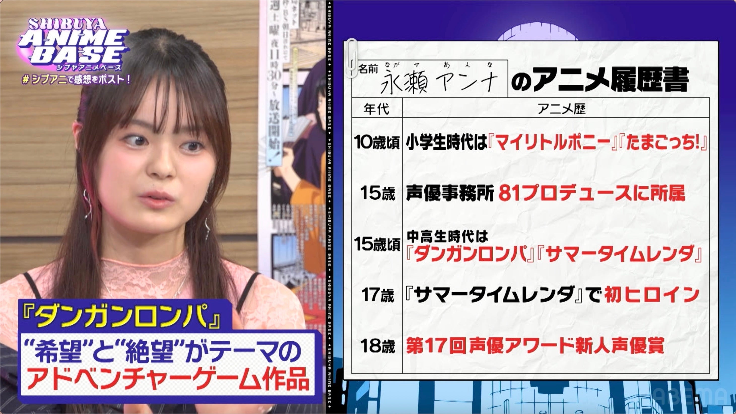 新しい未来のテレビ「ABEMA(アベマ)」は、「ABEMAアニメチャンネル」にて、2026年4月3日(金)夜9時〜10時にわたり『SHIBUYA ANIME BASE(#シブアニ)』#81を生放送し、放送終了後より無料見逃し配信を開始しました。今回は新スタジオからの放送となり、SPゲストに今注目の若手声優・永瀬アンナを迎えて、春の新作アニメ情報やゲストの素顔に迫る企画をたっぷりとお届けしました。