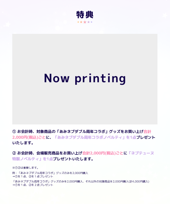 ①お会計時、対象商品の「あみネプダブル周年コラボ」グッズをお買い上げ合計2,000円(税込)ごとに、「あみネプダブル周年コラボノベルティ」を1点プレゼントいたします。