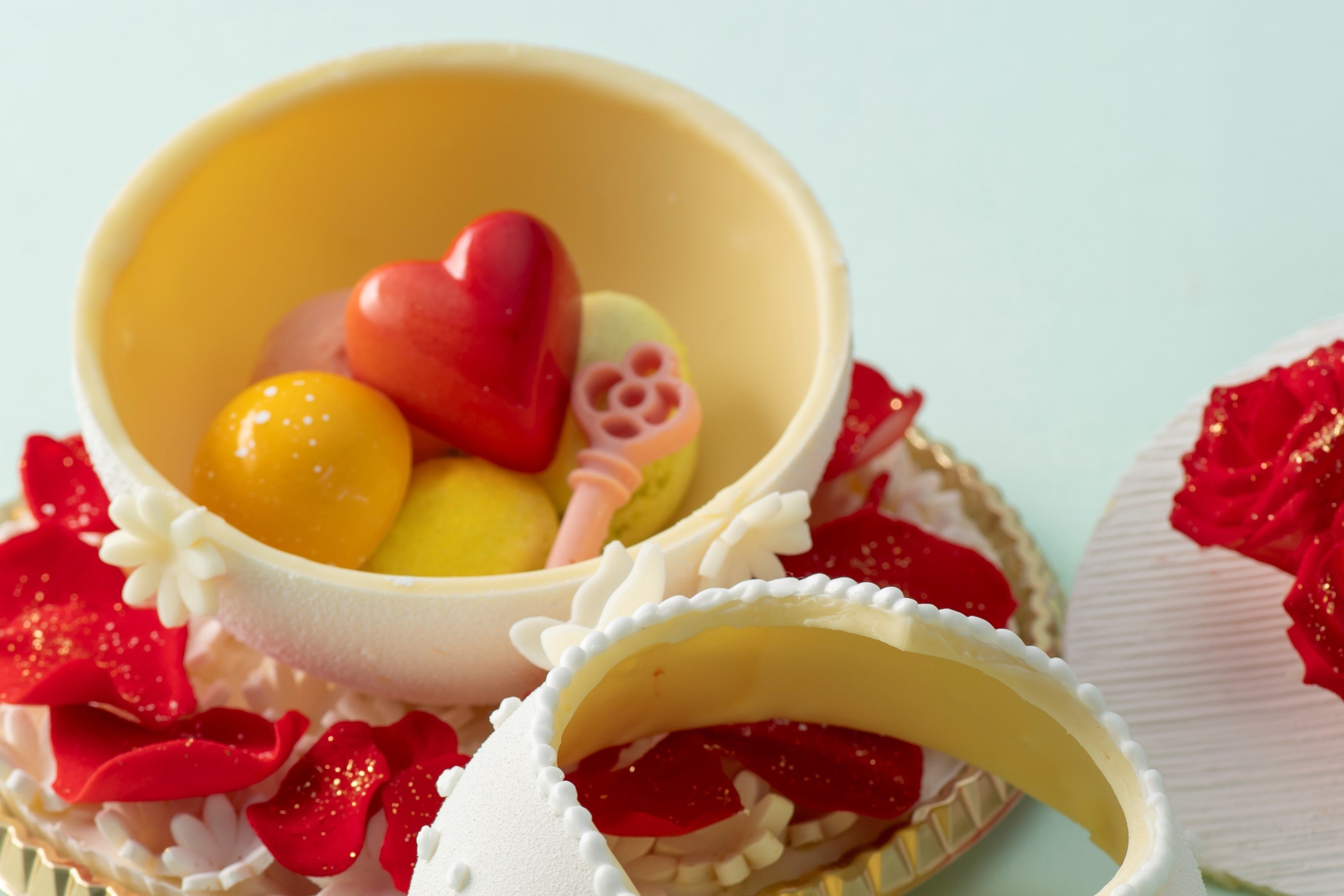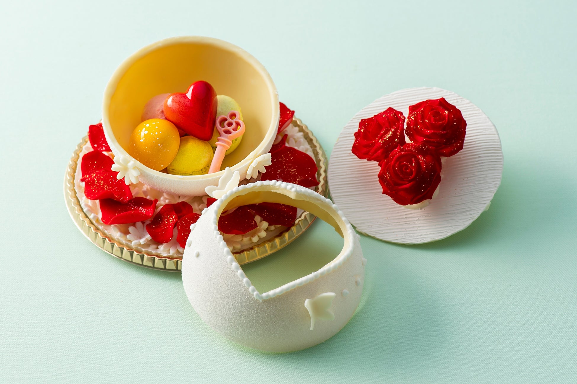 「愛情」の花言葉をもつ深紅のバラがブーケのようにあしらわれており、普段はなかなか伝えられない相手への気持ちを密やかに告げるスイーツです。中には可愛らしいマカロンやボンボンショコラ、心の扉を開く鍵をモチーフにしたチョコレートが入っています。受け取った方が思わず笑顔になるようなキュートで情熱的なギフトです。