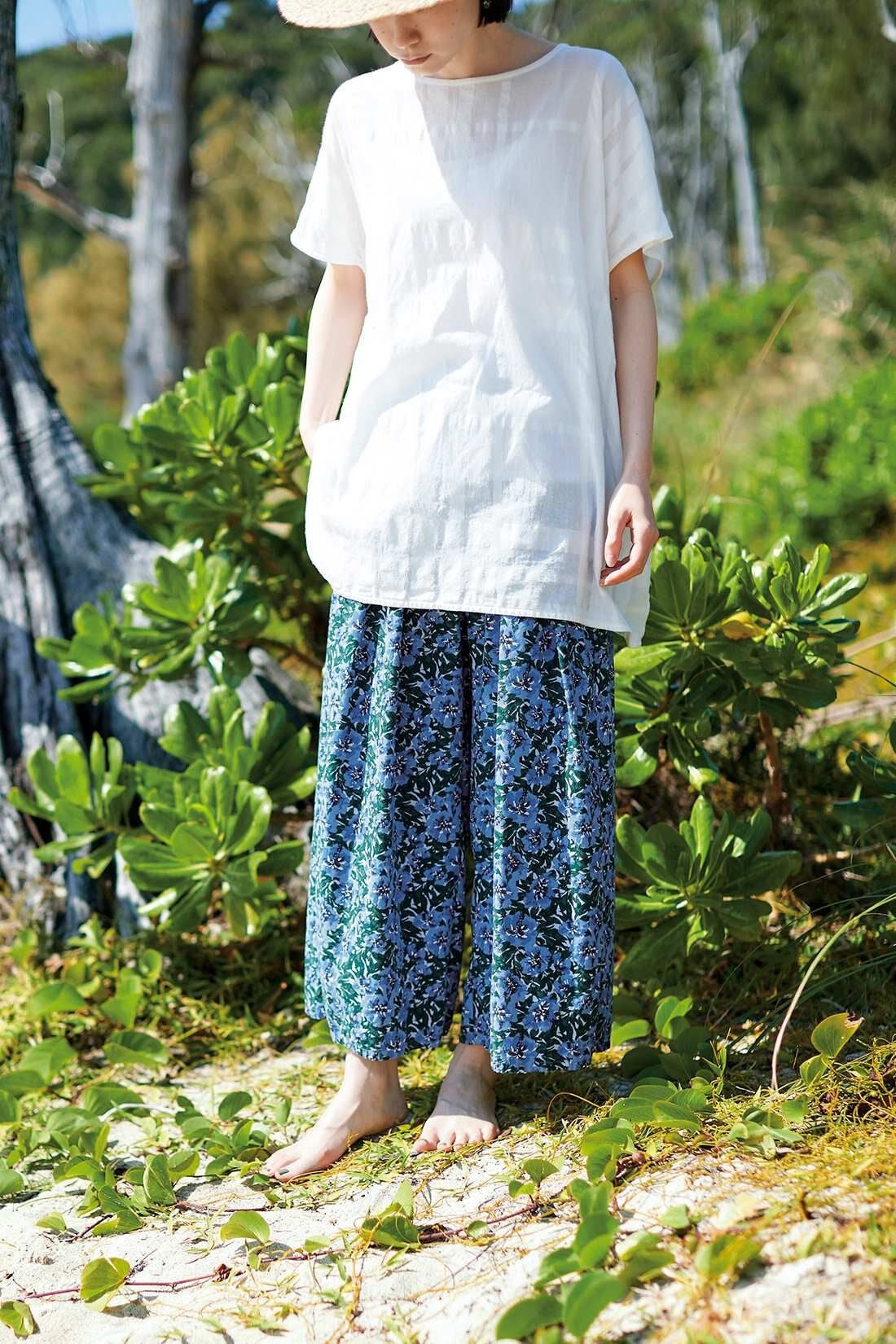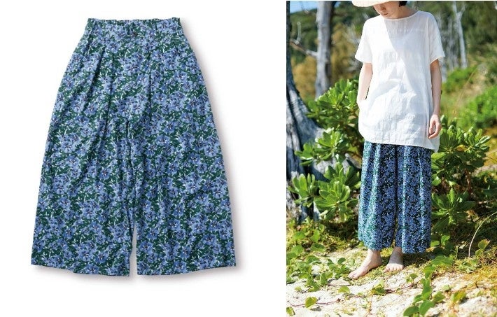 ハイビスカス柄を寒色系でまとめることで、リゾート感を程よく演出し、涼しげで着やすいキュロットパンツに仕上がりました。腰周りには前にタック、後ろにダーツをほどこすことで、すっきりとしたシルエットを実現しています。上品でさりげないリゾートスタイルを楽しみたい方向けの一着です。