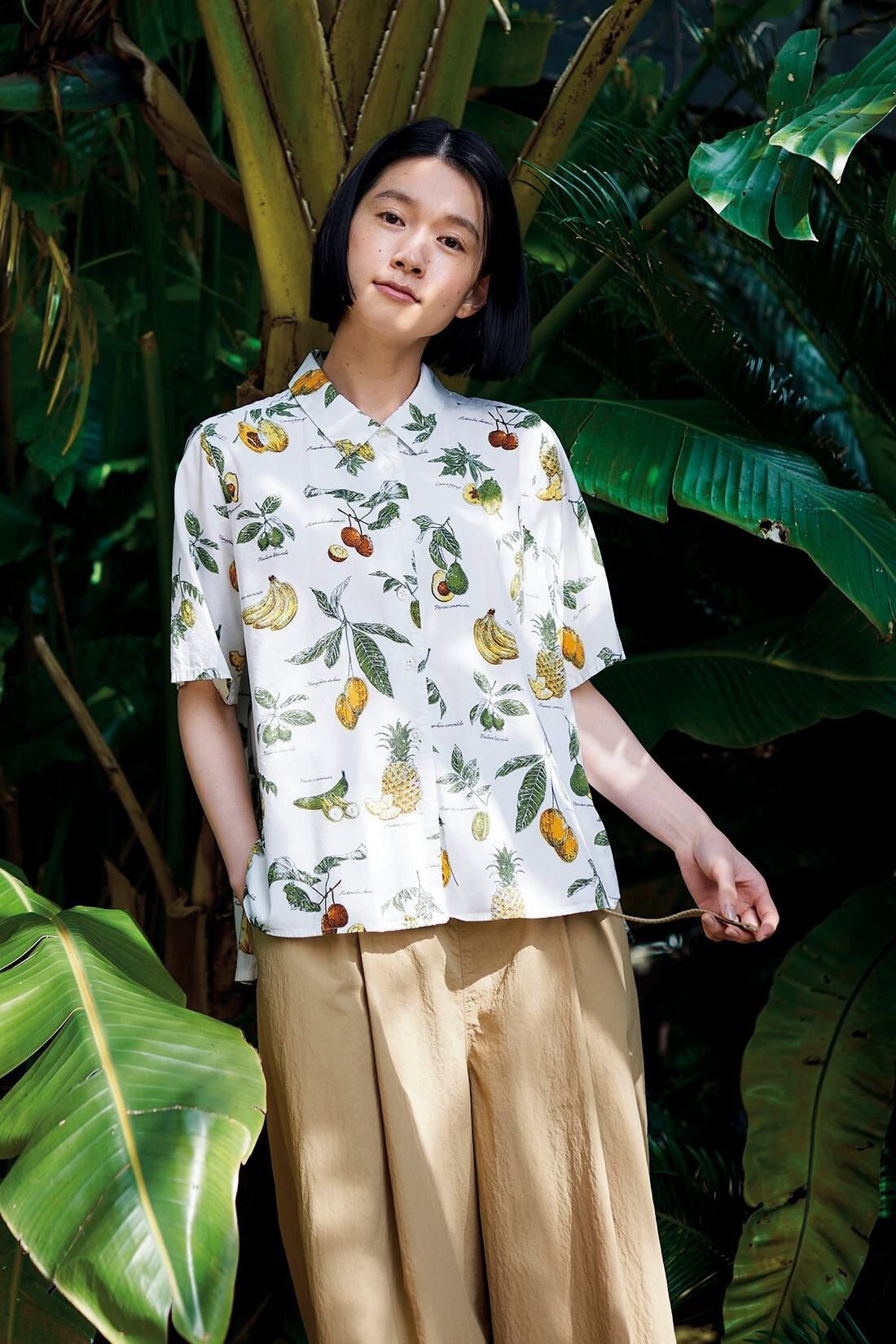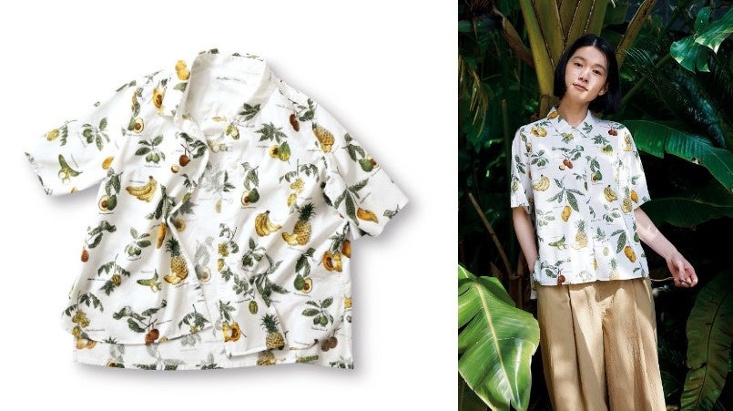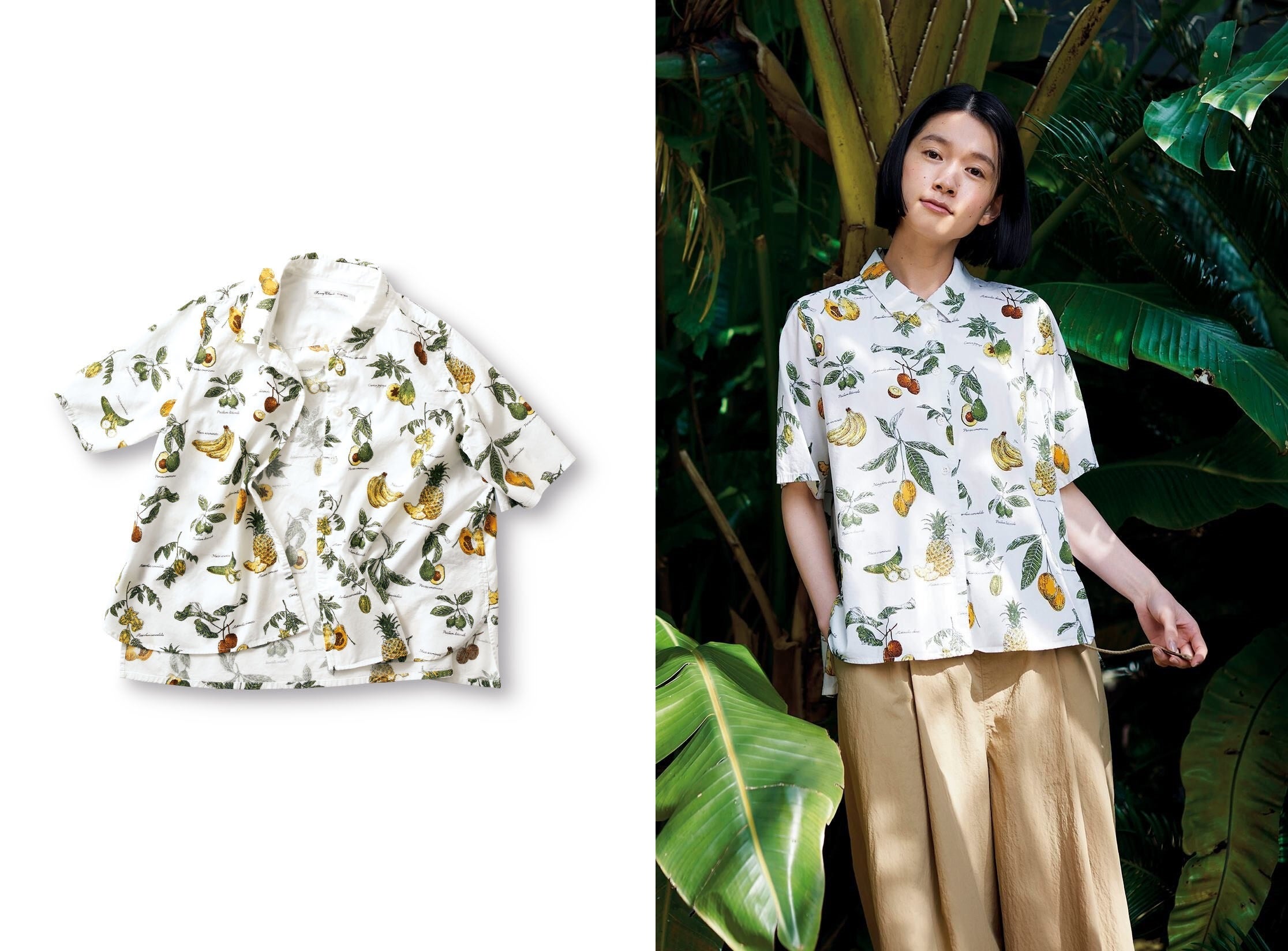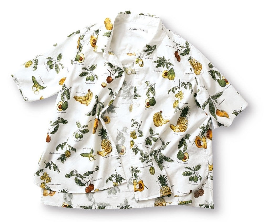 パパイヤ、マンゴー、キウイ、グァバ、スターフルーツなど、図鑑風のタッチで描かれた果物たちは、大人でも着こなしやすい上品さを持っています。デザインは、セットインスリーブのシンプルなシャツですが、すそに向けてフレアが加えられており、メンズライクになりすぎない女性らしいシルエットが魅力です。夏の装いにぴったりな、楽しくさわやかなシャツが完成しました。