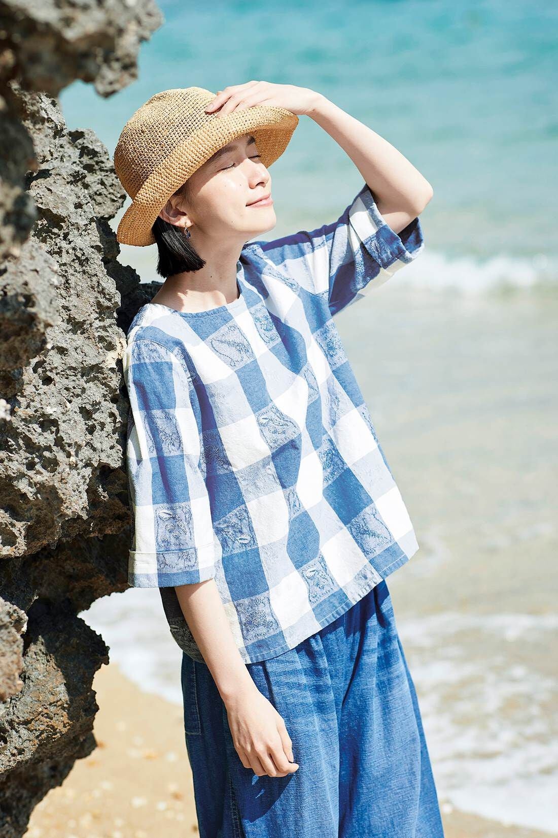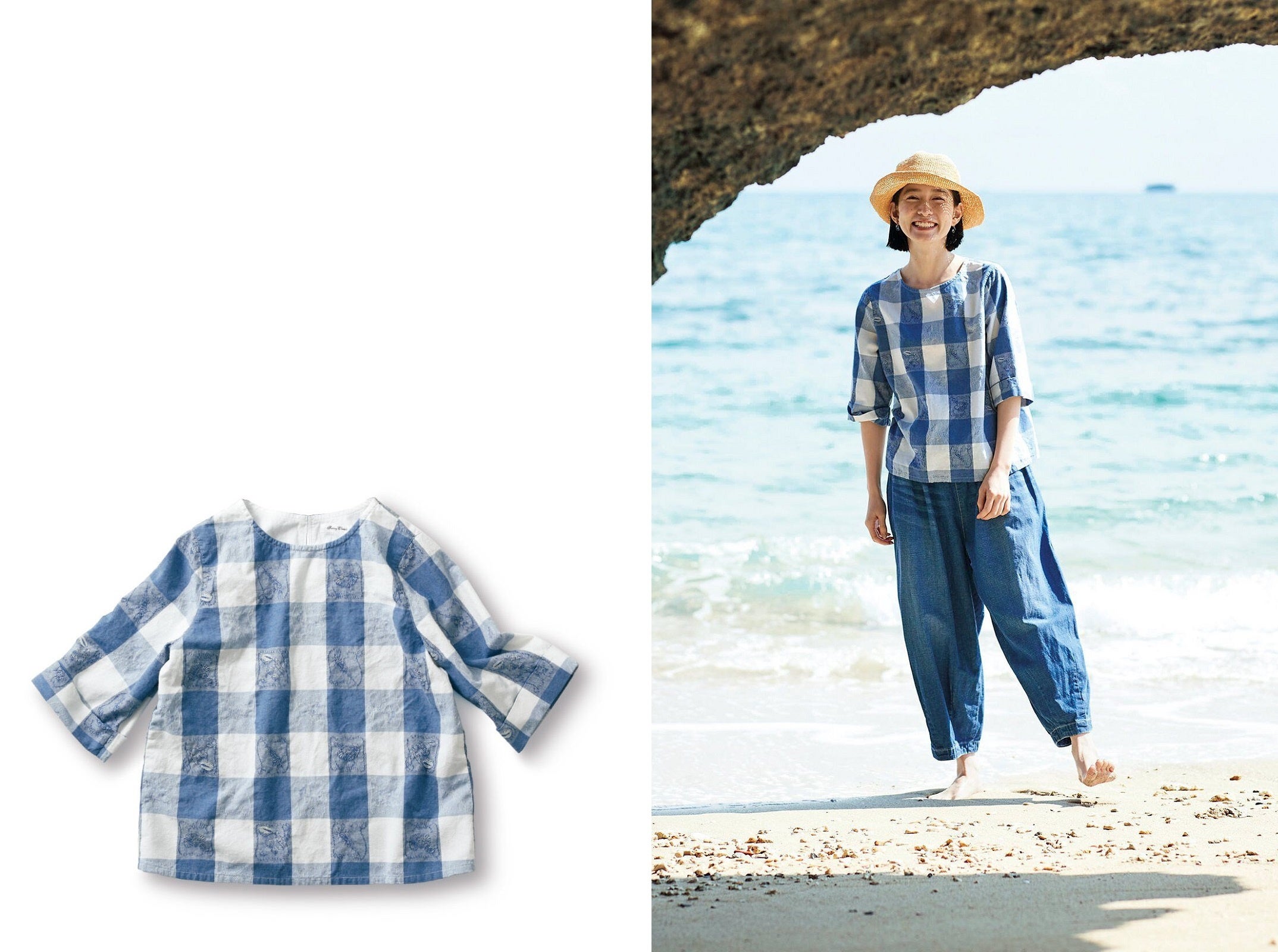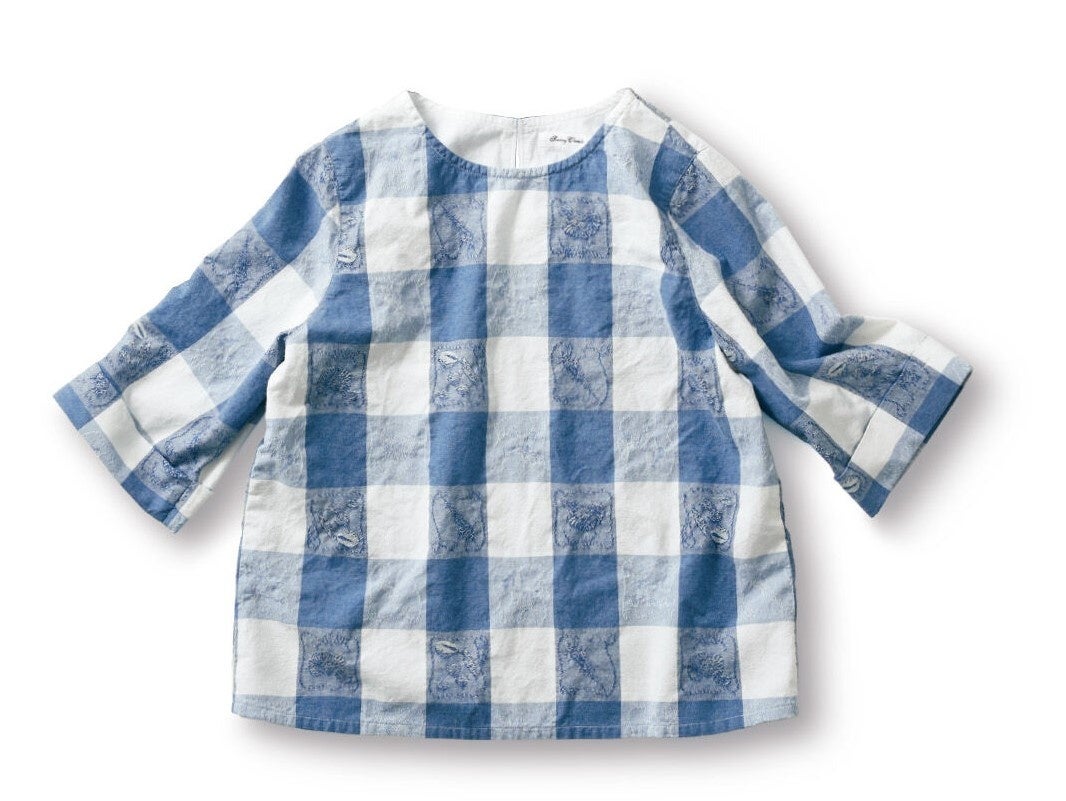 ジャカード織りで表現された美しい貝殻の模様が印象的な、優しい水色と白のギンガムチェックが涼しげな雰囲気を演出します。シンプルなデザインながら、袖口のダブルカフス始末がアクセントとなっており、大人の女性も楽しめる上品なデザインが魅力です。