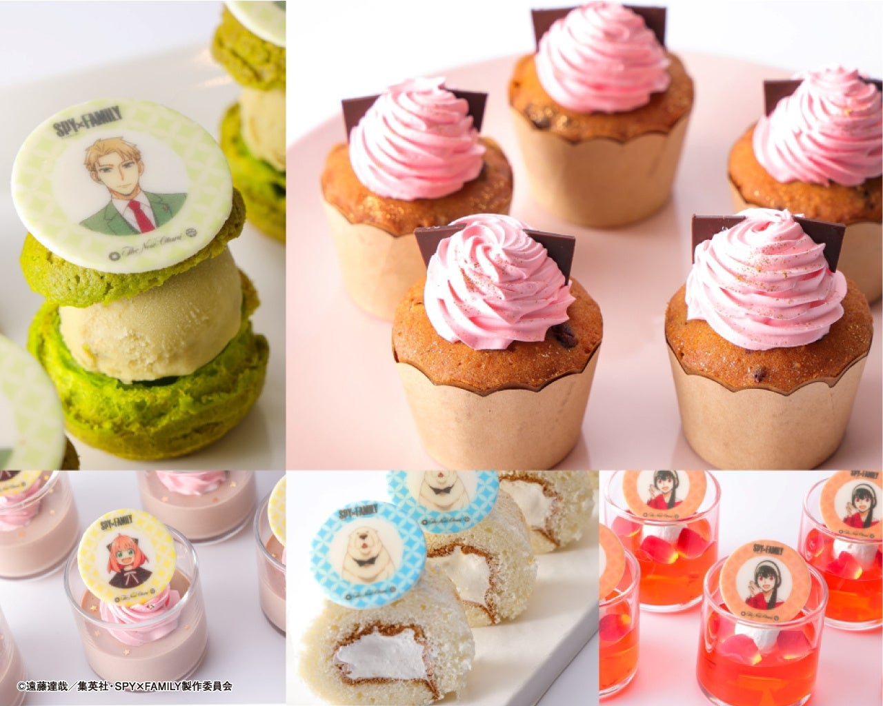 シェフパティシエがTVアニメ『SPY×FAMILY』をイメージした、見ても食べても満足のスイーツを5種類ご用意いたしました。一口サイズのシュー生地に、ピスタチオアイスをはさんで提供する「ロイドのピスタチオシューアイス」(左上)、ピーナッツ味のシフォンケーキに、チョコレートとピンク色の生クリームをあしらった「アーニャのピーナッツマフィン」(右上)、ココア風味のグラスデザート「アーニャのココアパンナコッタ」(左下)、また、お口直しにも最適な「ヨルのローズヒップゼリー」(右下)、真っ白なボンドをイメージした「ボンドのホワイトロールケーキ」(下中)もぜひご賞味ください。