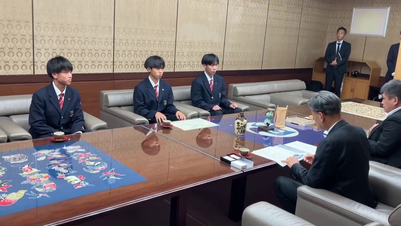 2024年9月28日に行われた『スポGOMI甲子園2024静岡県大会』で優勝した常葉大学附属橘高等学校(静静岡県静岡市、校長:関本和彦)在校生3人組の「勇猛果敢(ゆうもうかかん)」が、大会での成果を報告するため難波喬司市長を表敬訪問しました。