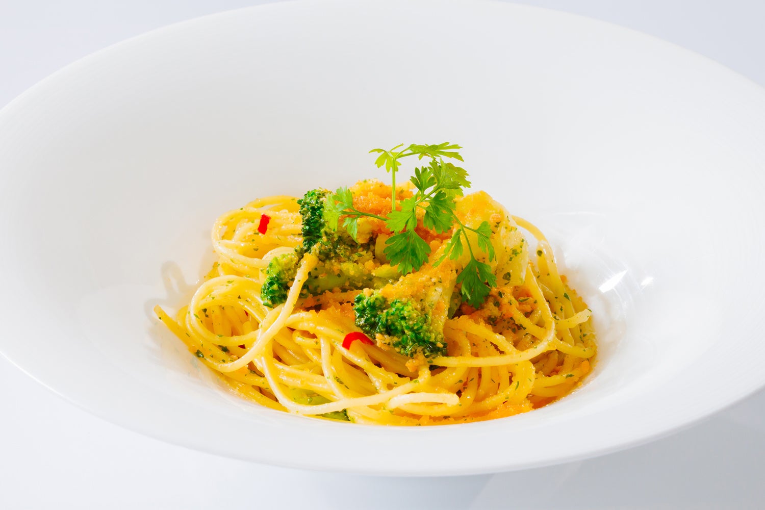 ・アンチョビとブロッコリーのペペノンチーノ ボッタルガを散らして