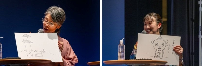 トークショーの最後には、「自由に灯台をデザインすることができたら」とのテーマで、作家の皆さんに絵を描いていただきました。「外から見ると一見普通の灯台だが、地下には巨大な空間がある灯台」を描いた門井さん。「(多くの)灯台は不便な場所にあるので、あえてそういう場所に公共的なスペースを作り、何に使うかはこれから(考えたい)」と解説してくださいました。人工衛星のように地球の周囲を回る謎の光を描いた川越さんは「遠い宇宙から帰ってきた宇宙船を『お帰りなさい』と迎える光を放つ、宇宙の灯台があればいいなと思いました」と説明しました。