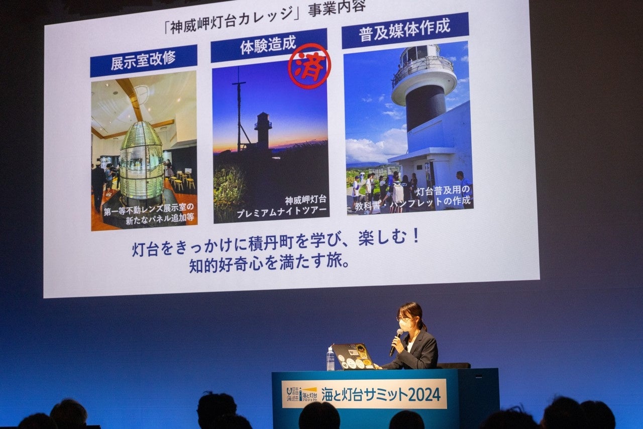 積丹町地域活性化協議会(北海道)の小山彩由里さんは、まちの地理や歴史を学ぶための教材として灯台を活用し、普段は立ち入りできない夜の灯台を訪ねるナイトツアーをはじめ、灯台普及用のパンフレット作成など知的好奇心を満たすさまざまなコンテンツを提供している「神威岬灯台カレッジプロジェクト」の取り組みを発表。灯台を観光資源として活用するだけでなく、教育的な価値を持たせることによって地域と海に関する学びが得られると共に、過疎化に悩む地域課題の解決につながる可能性があることを説明しました。