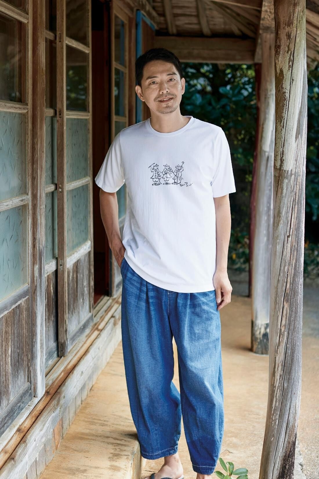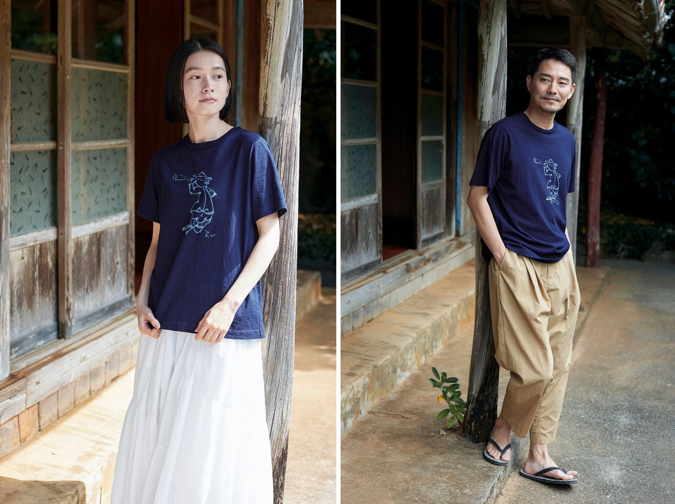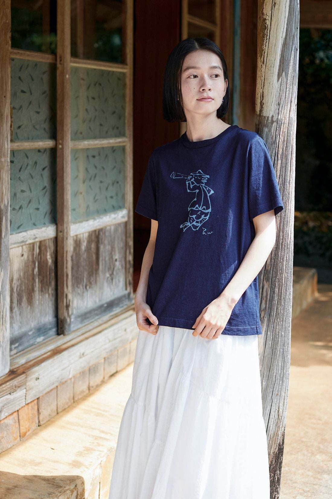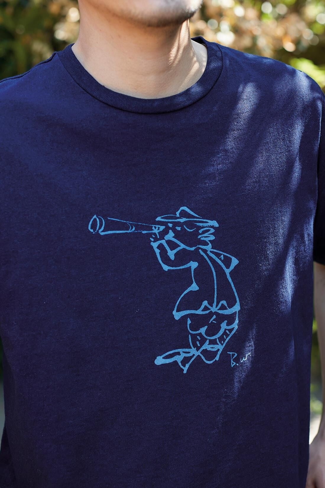 インディゴ天じくを用いた生地に、異人さんをプリントしたユニークなアイテムです。胸元に望遠鏡を覗く異人さんの大きなプリントと、後ろの右すそにはパイプのワンポイントプリントが特徴的。誰でも着やすいレギュラーサイズで、異人さんのユーモラスな魅力を毎日のスタイルに取り入れられます。
