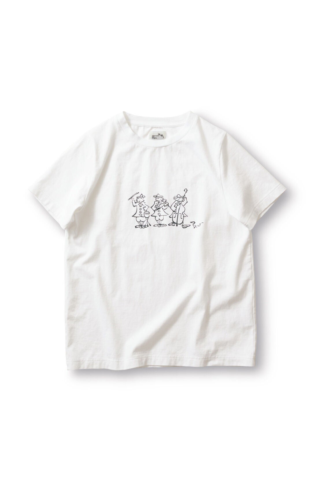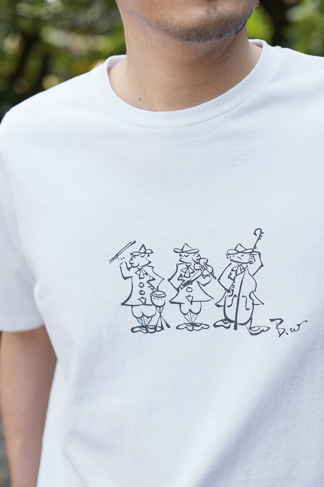 異人さんの音楽隊を描いたプリントTシャツです。ティンパニ・バイオリン・ベースを奏でる異人さんたちを、白いTシャツに墨黒を使い、線画でユーモラスに表現しています。レギュラーフィットで誰でも着やすく、異人さんの魅力を日常に取り入れることができます。