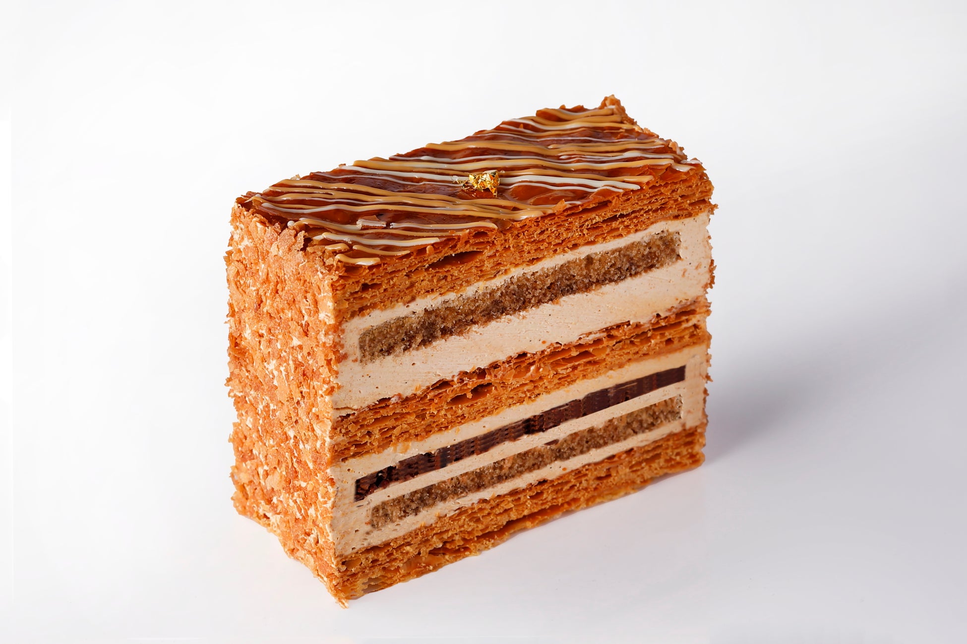 華やかなデコレーションが印象的なチョコレートケーキ。高さ8.5cmのその生地は14層にもなり、その1層1層には、厚みや食材を変えて極上の味を演出しています。2種類のガナッシュと、2種類のバタークリームを深い味わいのエスプレッソを含ませた7層のビスキュイで挟み、中にはカラメリゼしたアーモンドをアクセントに加えました。チョコレート好きにはたまらない大人の味わいです。
