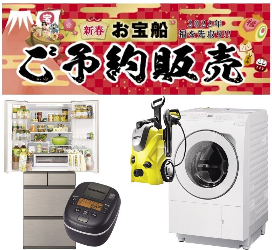 内容:家電製品を中心とした2点セット20万円(本体価格)のほか、調理家電や家具・寝具など暮らしの品を厳選特価で店舗とネットにて予約販売します。