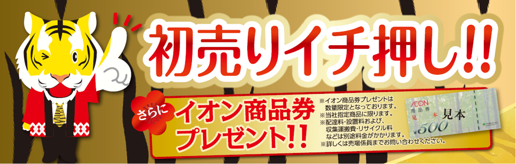 内容:地域で厳選した家電や寝具といった暮らしの品を中心とした均一価格商品など、初売りイチ押し商品を多数ご用意します。さらに本体価格19,800円以上の指定商品にイオン商品券1,000円~10,000円のプレゼント特典があります。