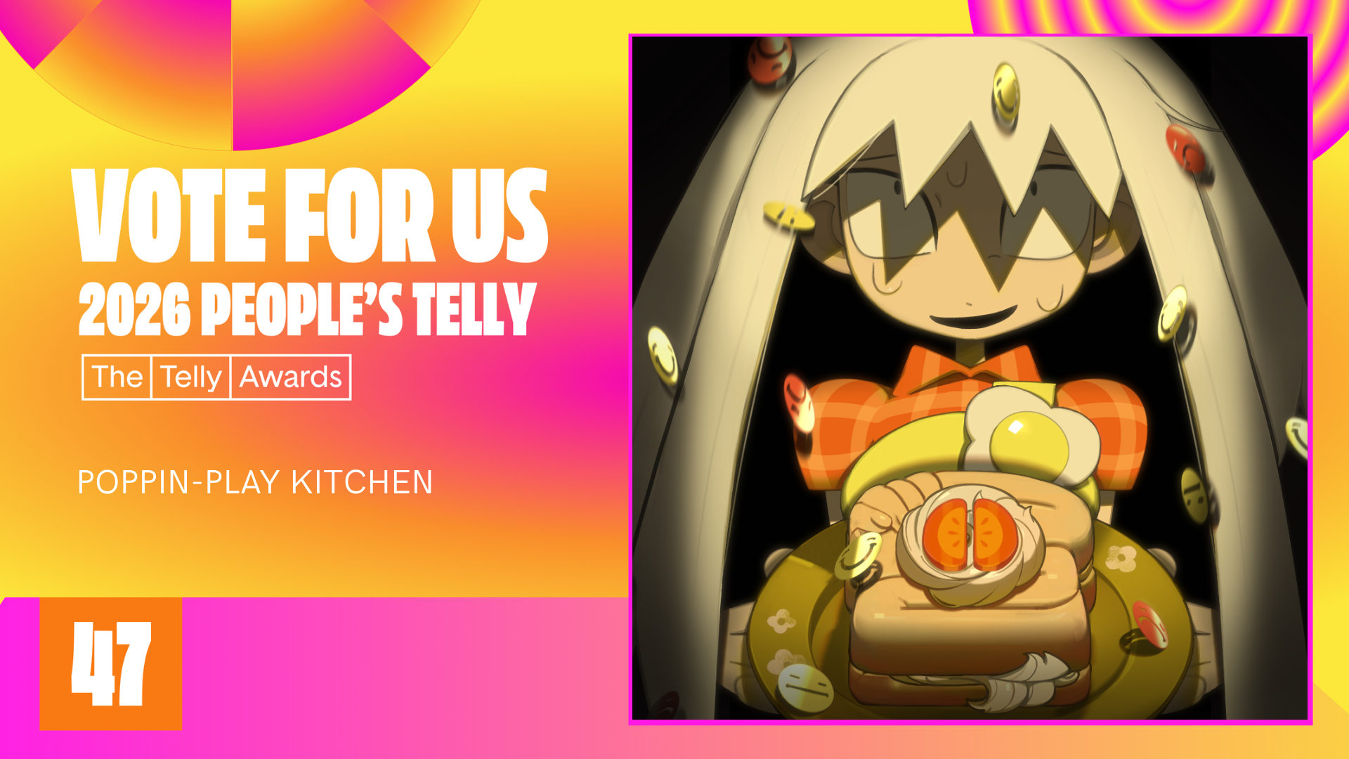 『Poppin-Play Kitchen』が、「テリー賞 People's Telly部門」にノミネート!?私たちの小さなプロジェクトがここまで来れたことを本当に嬉しく思いますし、これからどこまで行けるのか、皆さんに見ていただけるのが楽しみで仕方ありません!この賞の金賞は一般投票で決まります。皆さんの一票が私たちにとって何よりも大きな力になります!いつも温かい応援を本当にありがとうございます…!この美しくも恐ろしい世界をもっと皆さんにお見せできることを願っています!