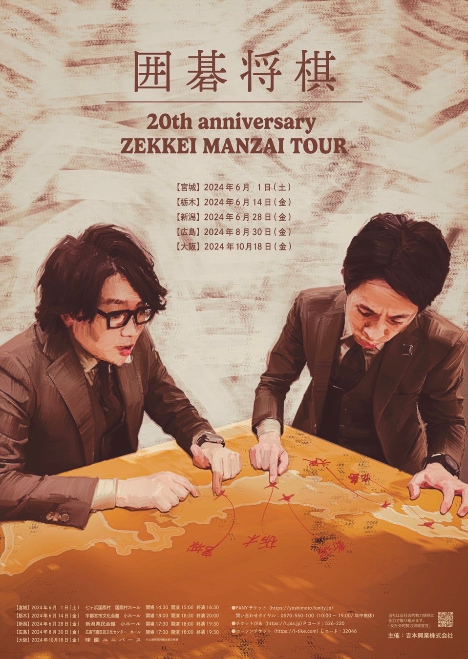 結成20周年を迎えた吉本興業所属・囲碁将棋による全国ツアー「囲碁将棋20th anniversary ZEKKEI MANZAI TOUR」が、6月1日(土)宮城・七ヶ浜国際村ホールを皮切りに全国5都市にて開催することが決定しました。