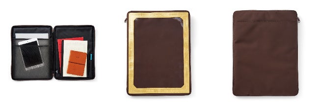 メッシュ素材の内ポケットは書類の仕分けに便利な2段仕様になっていて、タブレットなどの持ち運びもできます。芯材入りで、ミュージアムで手に入るパンフレットを持ち帰るときに折れ曲がりにくいのも特徴です。裏面にある深めのポケットは、パンフレットの保管や資料の持ち運びにも便利です。
