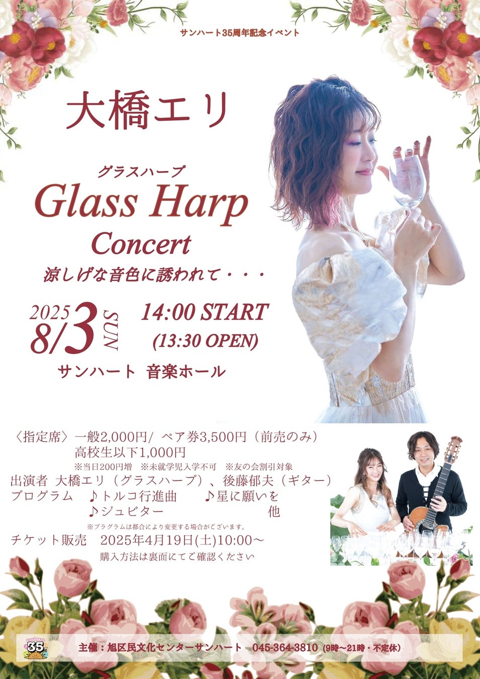 横浜市旭区民文化センター サンハート主催、『大橋エリ Glass Harp Concert』が2025年8月3日 (日)に横浜市旭区民文化センター サンハート 音楽ホール(神奈川県 横浜市旭区 二俣川 1-3 ジョイナステラス3(旧・二俣川ライフ)5F)にて開催されます。