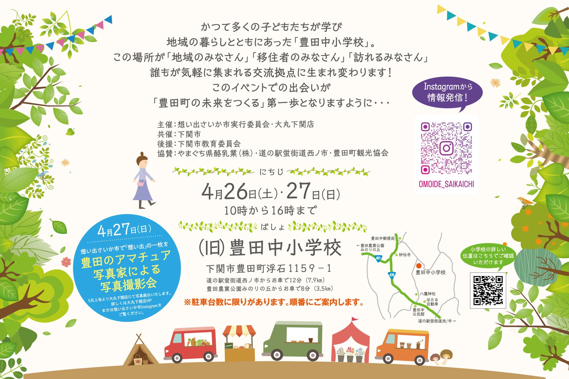 2021年3月に閉校、地域の方々から惜しまれつつ108年の幕を下ろした山口県下関市の豊田中小学校。この山のなかの小さな小学校を会場に、2022年4月・2023年11月に続いて3回目の「想い出さいか市(おもいでさいかいち)」を開催いたします。廃校の活用を通して関係人口を創出し、地域コミュニティの再生と活性化を目指すイベントで、想い出さいか市実行委員会と大丸下関店が主催、下関市の共催です。