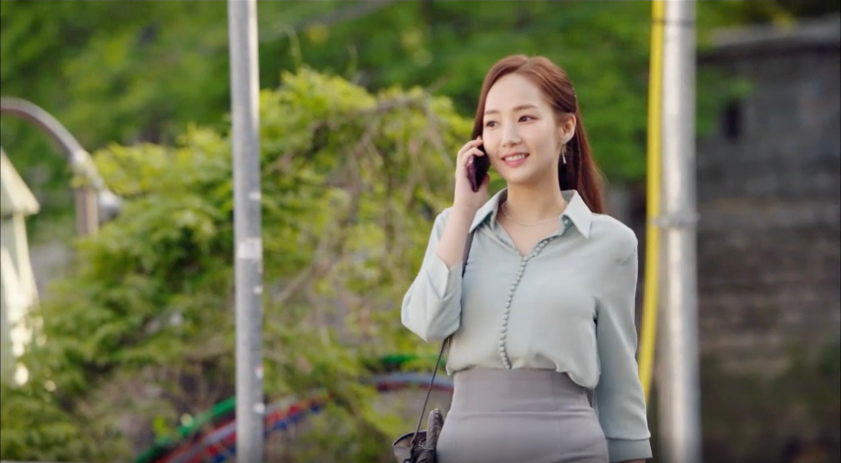 オフィスファッションの金字塔とされるミソのスタイル。「とろみブラウス×ハイウエストのタイトスカート」という鉄板の組み合わせは、スタイルを最大限に美しく見せる黄金比。清潔感溢れるパステルカラーの色使いや、歩くたびに揺れる高めのポニーテールは、「仕事も美貌も完璧」なヒロインの象徴です。