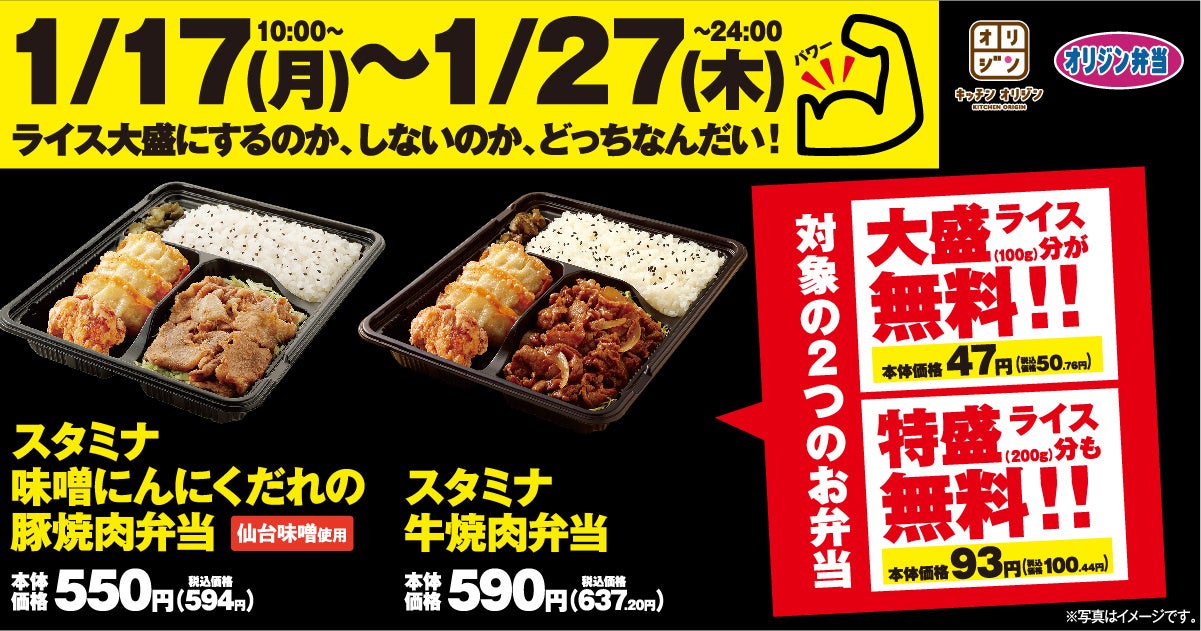 弁当・惣菜専門店「オリジン弁当」「キッチンオリジン」を展開しているイオングループのオリジン東秀株式会社(本社:東京都調布市/代表:沢村 弘也)は、1月17日(月)10時から1月27日(木)24時の間限定で『スタミナ焼肉弁当ライス大盛・特盛無料フェア』を開催し、「スタミナ味噌にんにくだれの豚焼肉弁当」「スタミナ牛焼肉弁当」のライス大盛・特盛を無料にいたします。