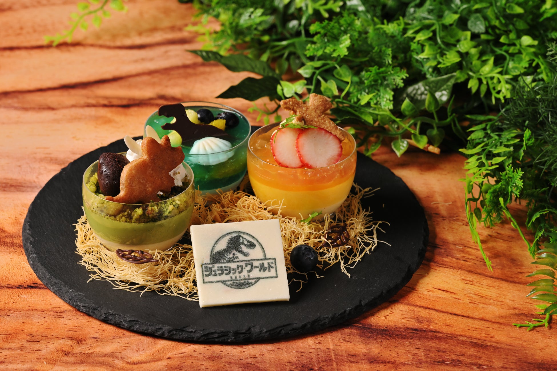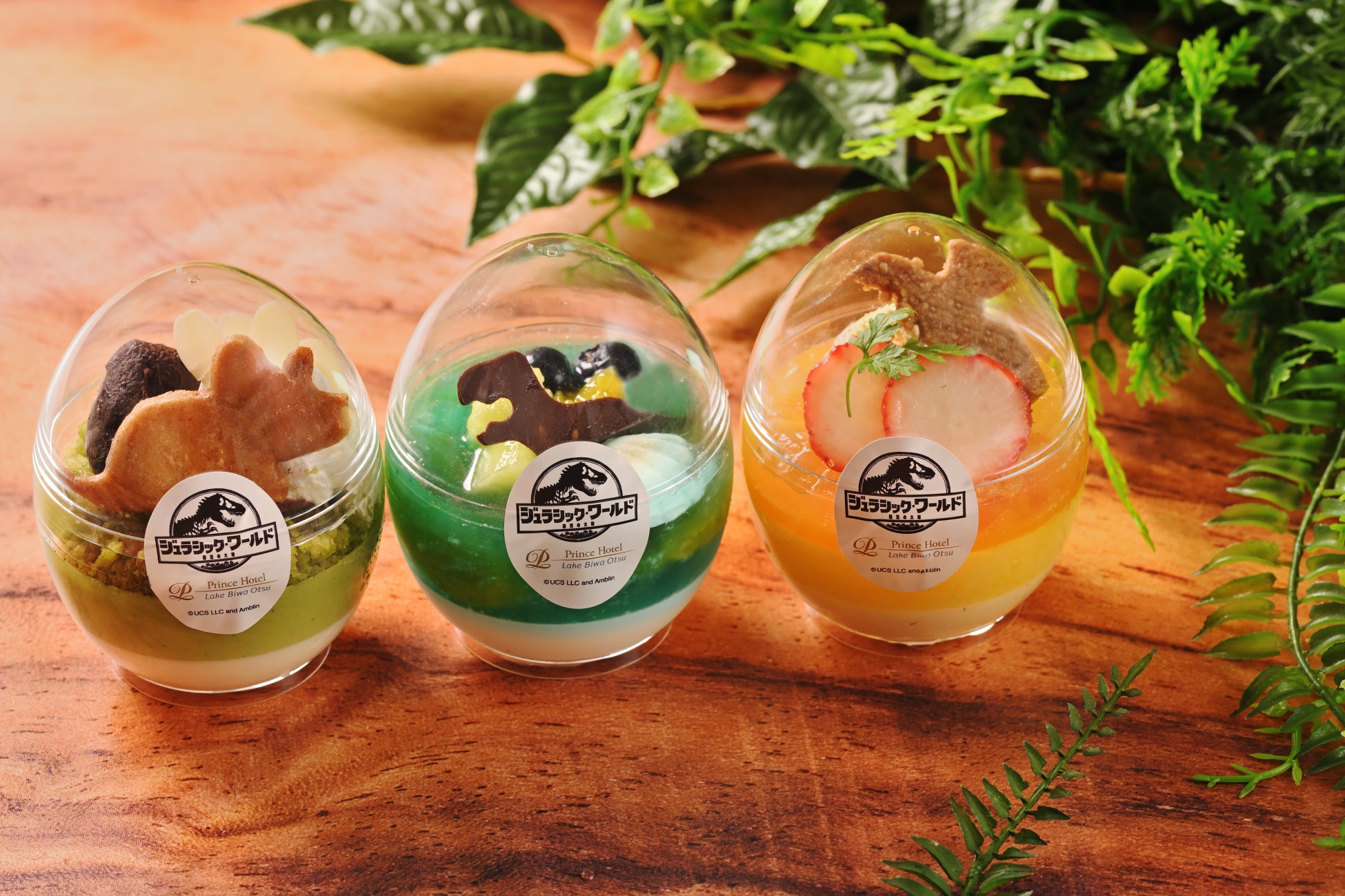 体験のひとつとして、映画史に名を刻む大ヒットシリーズ最新作『ジュラシック・ワールド/復活の大地』の公開を記念して、かわいらしいたまご型のスイーツで世界観を表現したコラボレーションメニューも登場。シリーズのカギとなる “陸・海・空”をテーマにした3種のヴェリーヌを、「ロビーラウンジ ポート ニオ(1F)」にて、店内またはテイクアウトでお楽しみいただけます。また、映画のファンやご家族の皆さまに嬉しい、「プリンスホテル限定ポストカード」と「作品ステッカー」を先着でプレゼントいたします。