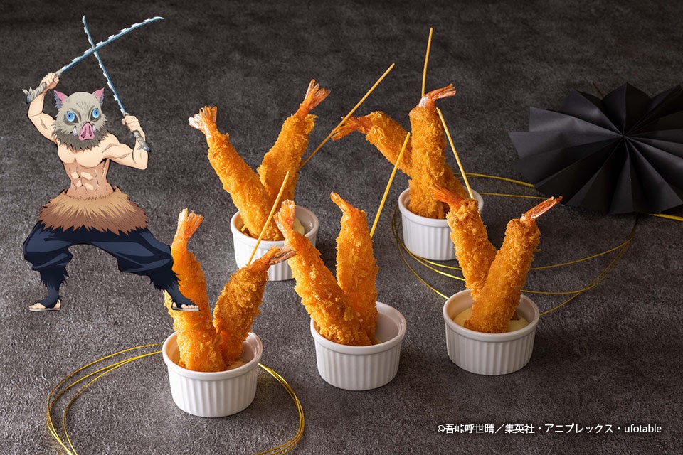 豪快な見た目が印象的な「伊之助の二刀流︕エビフライ」は、エビフライ2本を刀に見立て、嘴平伊之助の二刀流を表現。竈門禰豆子をイメージした「禰豆子の若竹抹茶“ムームー”ムース」は、竹の容器に抹茶ムース、その上にピンクのクリームを飾りました。