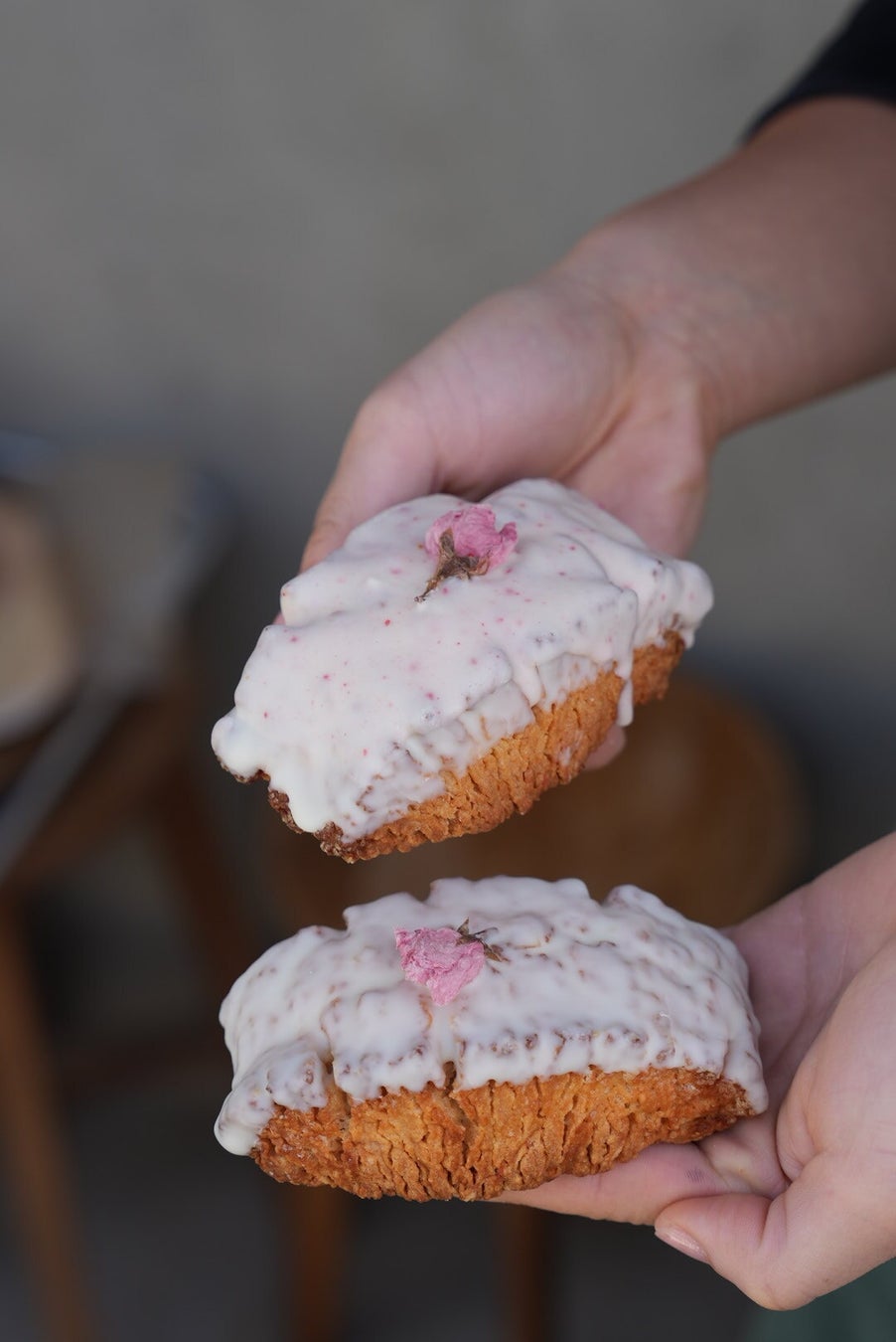2024年笹塚にオープン以来、人気のベーカリー<dough-ist>。湯種ブリオッシュ生地に粒あんを包み、たっぷりの生クリームを絞った生クリームあんぱんから限定の桜が登場。桜の塩漬けの塩味がいいアクセントに。北海道産小麦と発酵バターを使用し、ヨーグルトで仕込みバターを折り込むオリジナル製法のスコーン。限定フレーバーの桜はホワイトチョコの甘味と桜の塩気が良く合います。