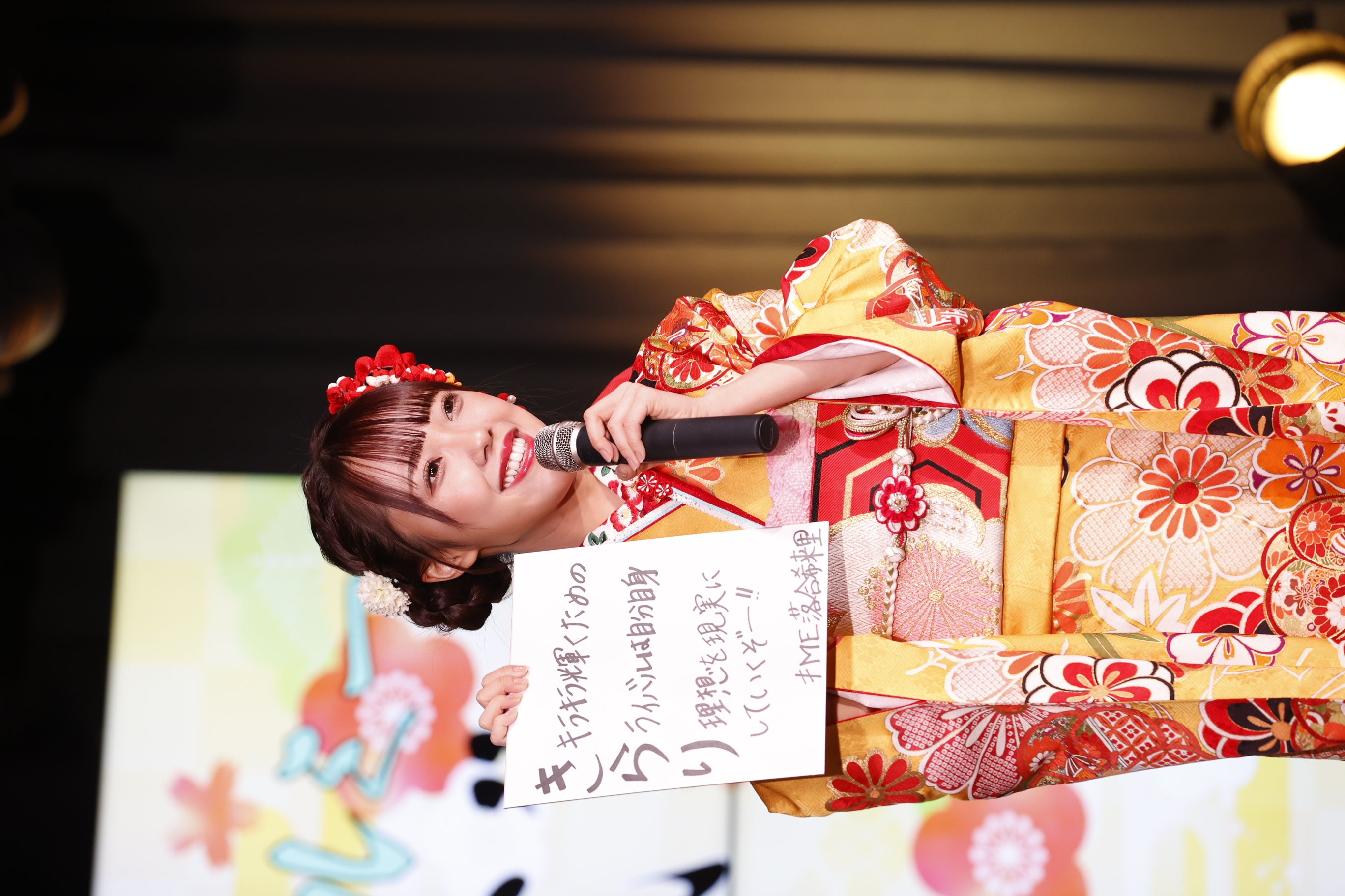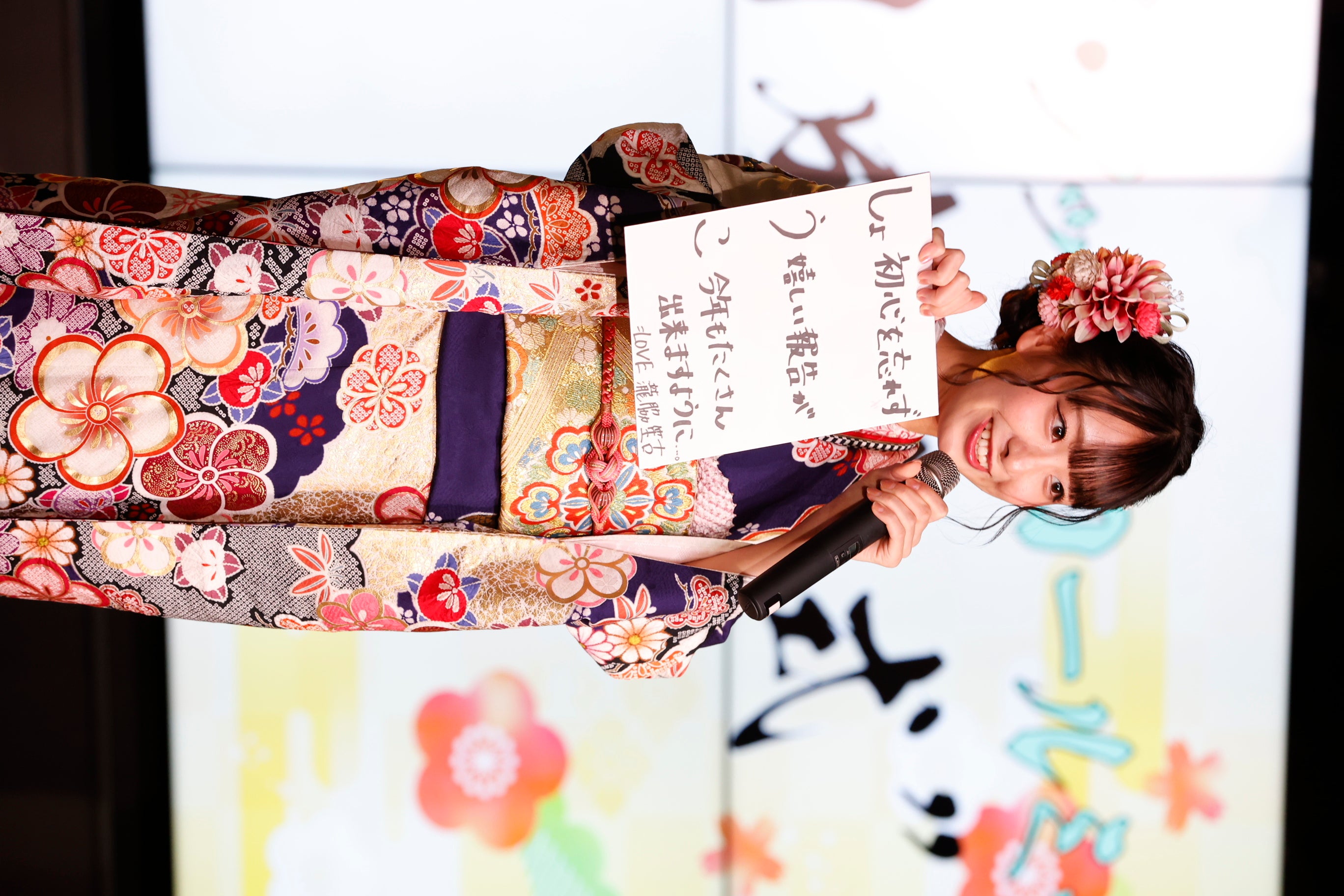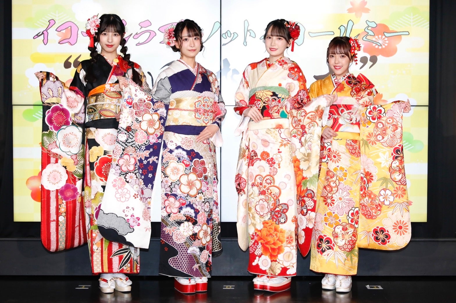 振袖姿の瀧脇笙古(=LOVE)/ 落合希来里 (≠ME)、河口夏音 (≠ME)、鈴木瞳美(≠ME)が、「あいうえお作文」で成人の抱負を発表!瀧脇は寅年にちなみ「私たちがウルトラ世代!」と宣言!