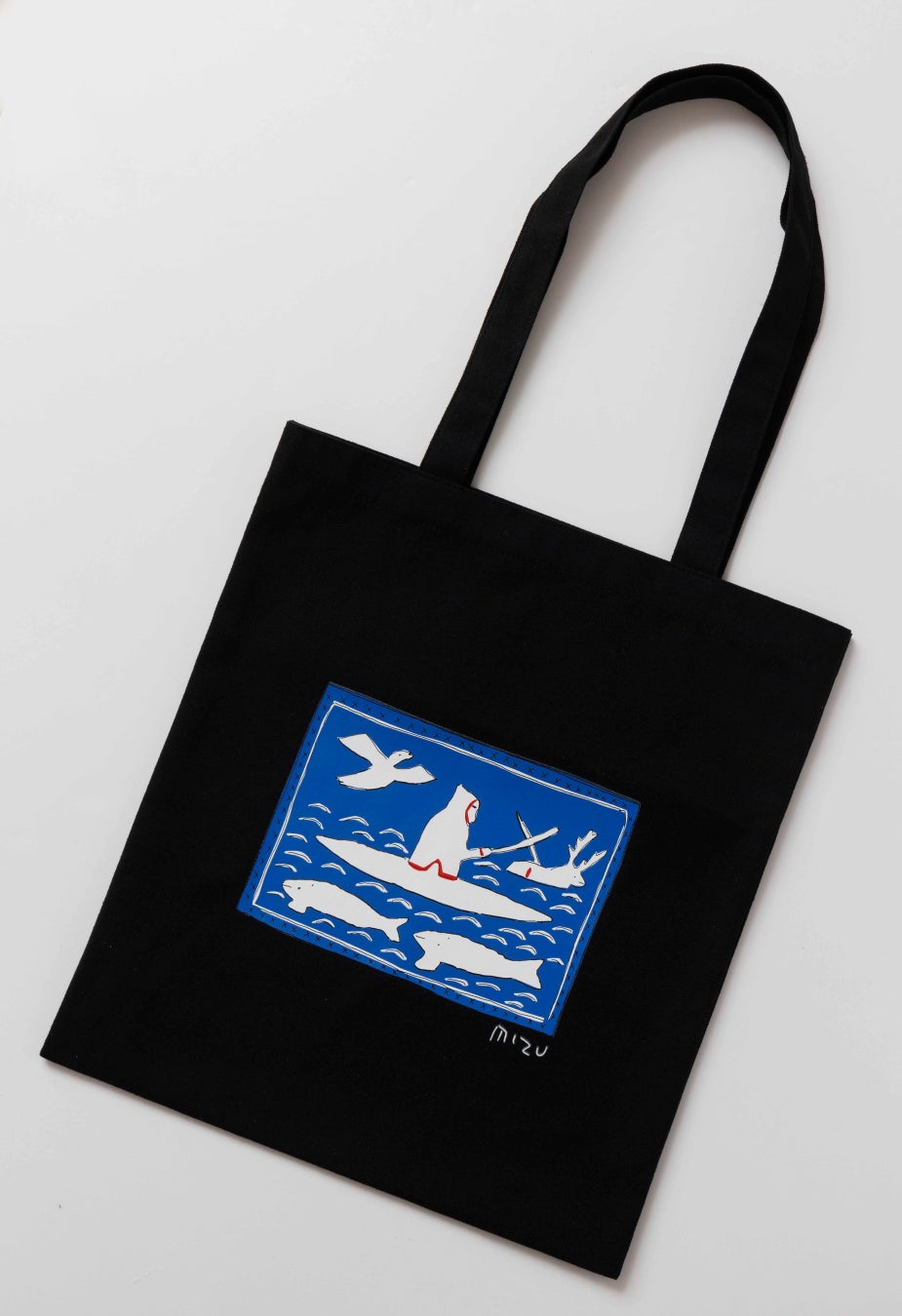 サイズは、本体部 縦36cm×横32cmと使いやすい大きさ。厚手の生地で、ブラック地に爽やかなブルーのイラストが映える。安西水丸さんがアラスカを旅した想い出を題材に描いた「イヌイット」をプリント。サインも入っています。