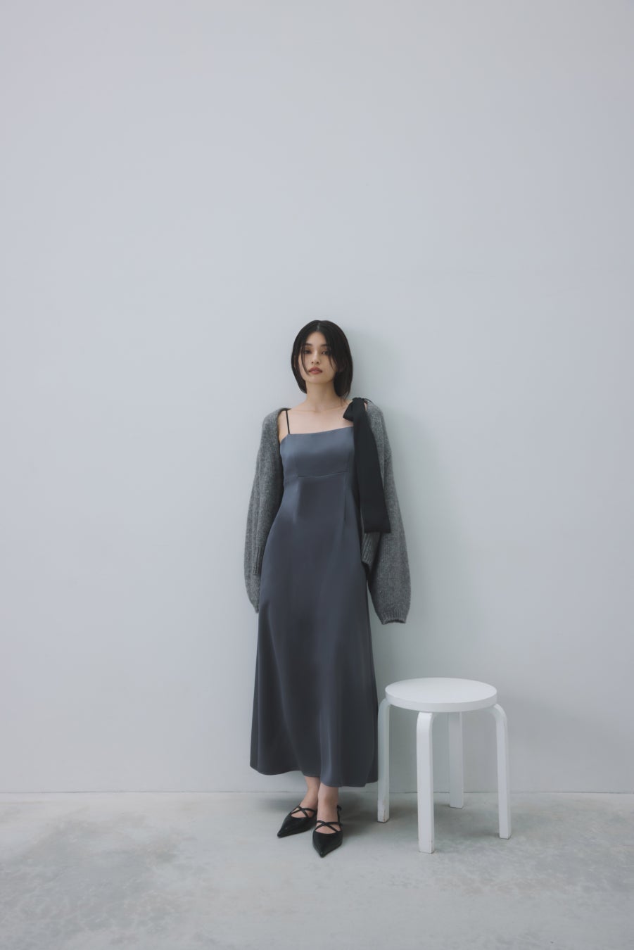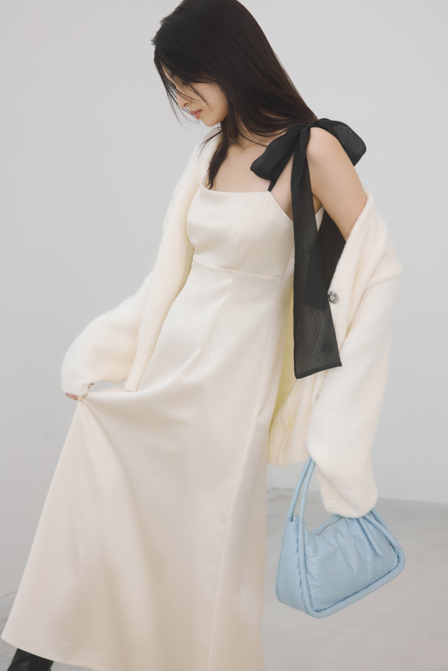 スッキリとしたナローフレアシルエットのキャミワンピースは、身体のラインを拾いにくいしっかりとしたサテン地。大きなリボンが目を惹く