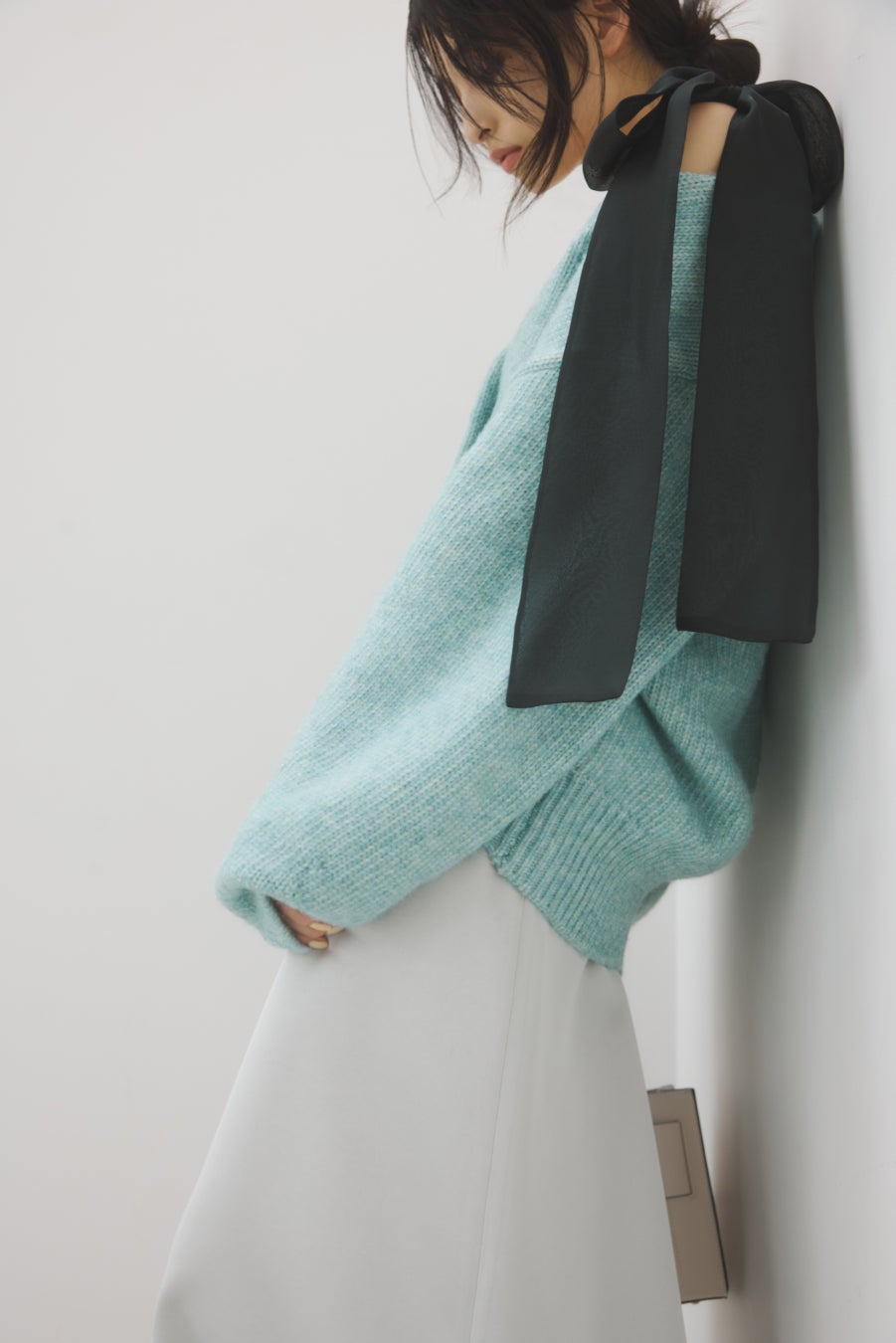 ショルダーデザインで、インナーにニットやカットソーを合わせても、セットのカーディガンからリボンをのぞかせてもポイントに。ストラップがポイントのバックオープンデザインで、後ろ姿も抜かりなく。