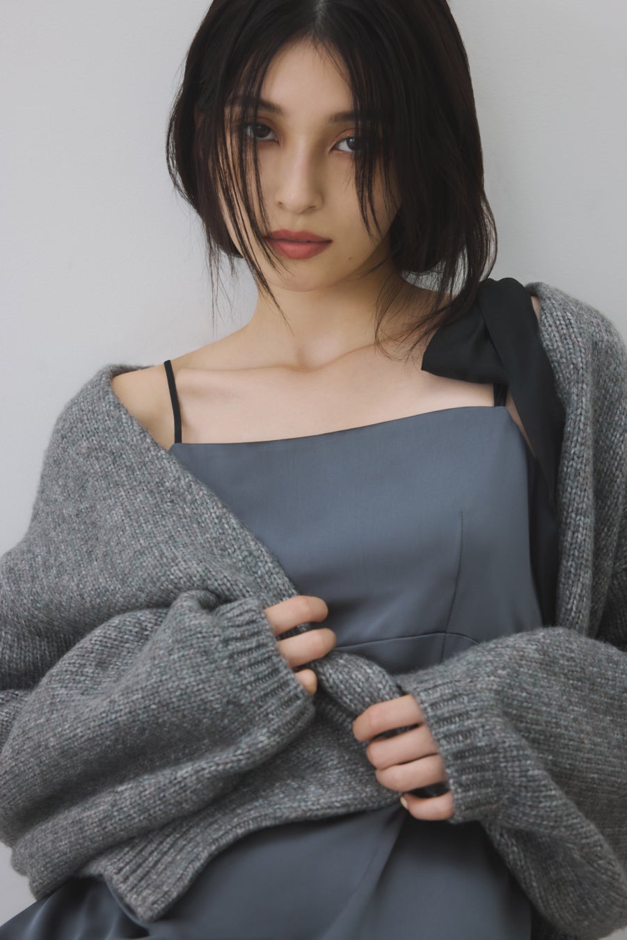 ふんわりとした太番手の糸で編み上げたカーディガンは、羽織りやすいオーバーサイズ仕上げ。前にボタンが出ないスナップボタン仕様とVネックのすっきりとしたデザインで、セットのキャミワンピースに合わせるだけでなく、日々のワードローブでも活躍するアイテム。