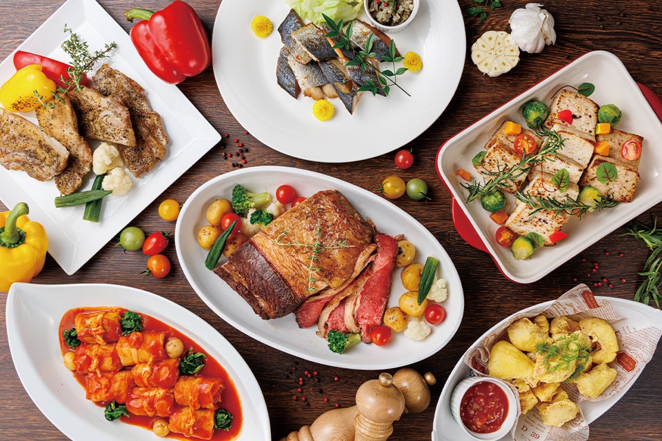 爽やかなハーブ香るローストチキンやロールキャベツなど6種のメイン料理をテーブルオーダーでお好きなだけ。「春の食べ放題ランチプラン」を販売