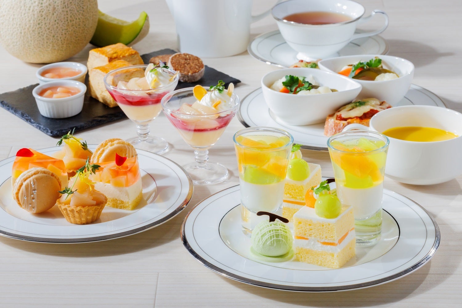 コクのある甘みの赤肉メロンと爽やかな味わいの青肉メロン、口当たり滑らかなココナッツのパンナコッタ、メロン風味のジュレを涼やかなグラスに重ねた「メロンのクープ」や、メロンを象った愛くるしいフォルムの「メロンムース」のほか、レモンのフレッシュな酸味が桃のまろやかな甘みを一層引き立たせる「桃とレモンのタルト」、桃と相性の良いレアチーズケーキに、桃を閉じ込めたローズ風味のゼリーを重ねた「桃のレアチーズケーキ」など、製菓料理長 清水裕史が手掛ける繊細で上質なスイーツ10品をお楽しみいただけます。