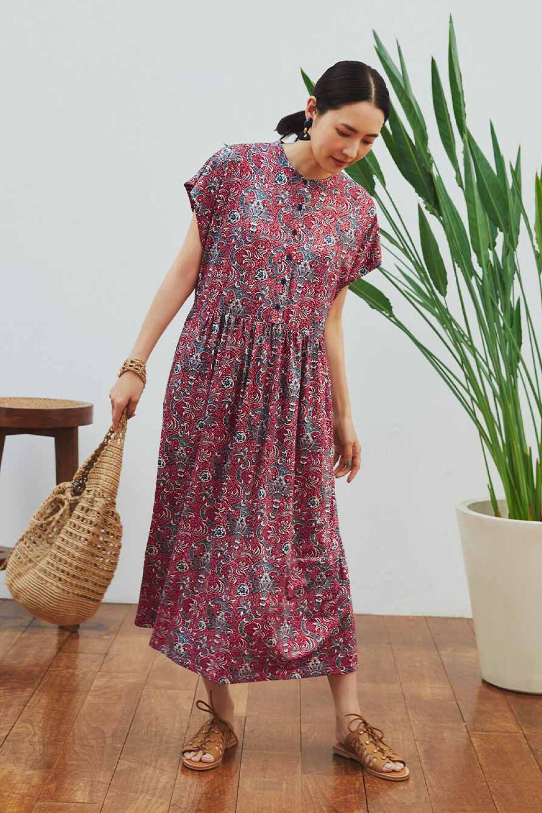 とろんとやわらかな落ち感の、美しい柄の夏ドレスです。袖は切り替えがなく、肩から二の腕を自然にカバーします。ボタン開きのトップス部分と、ウエストのギャザー切り替えのさりげないメリハリで、すっきりと着こなせます。