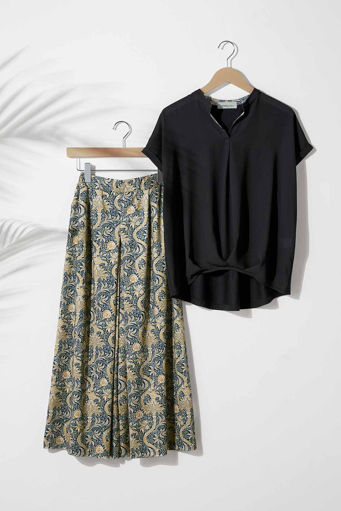 【NEW】リブ イン コンフォート 大人モリスの世界 「INDIAN柄」の美しく着映えるカットソーセットアップ〈ブラック×ブルーグレー〉