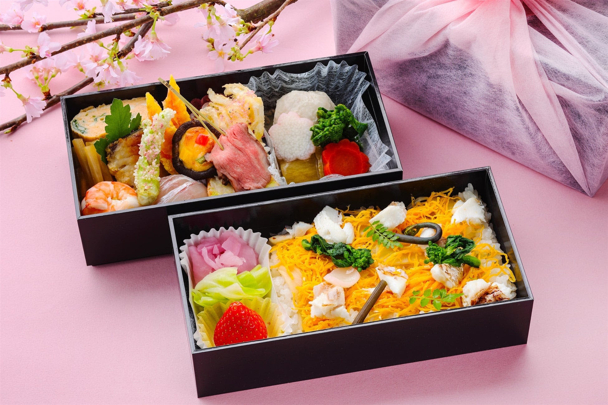 春のお手土産やお花見シーズンにぴったりなテイクアウトメニューも勢ぞろい!ホテルニューオータニ幕張では、和・洋・中の約50種類のテイクアウトメニューや、ホテル内のペストリーショップ「パティスリーSATSUKI」のテイクアウトスイーツを通年でご用意*。さらに、約20品目の海の幸と山の幸を盛り込んだ「春爛漫弁当」が春季限定で登場します。桜舞う季節に、ご自宅やお花見の場でぜひお召し上がりください。