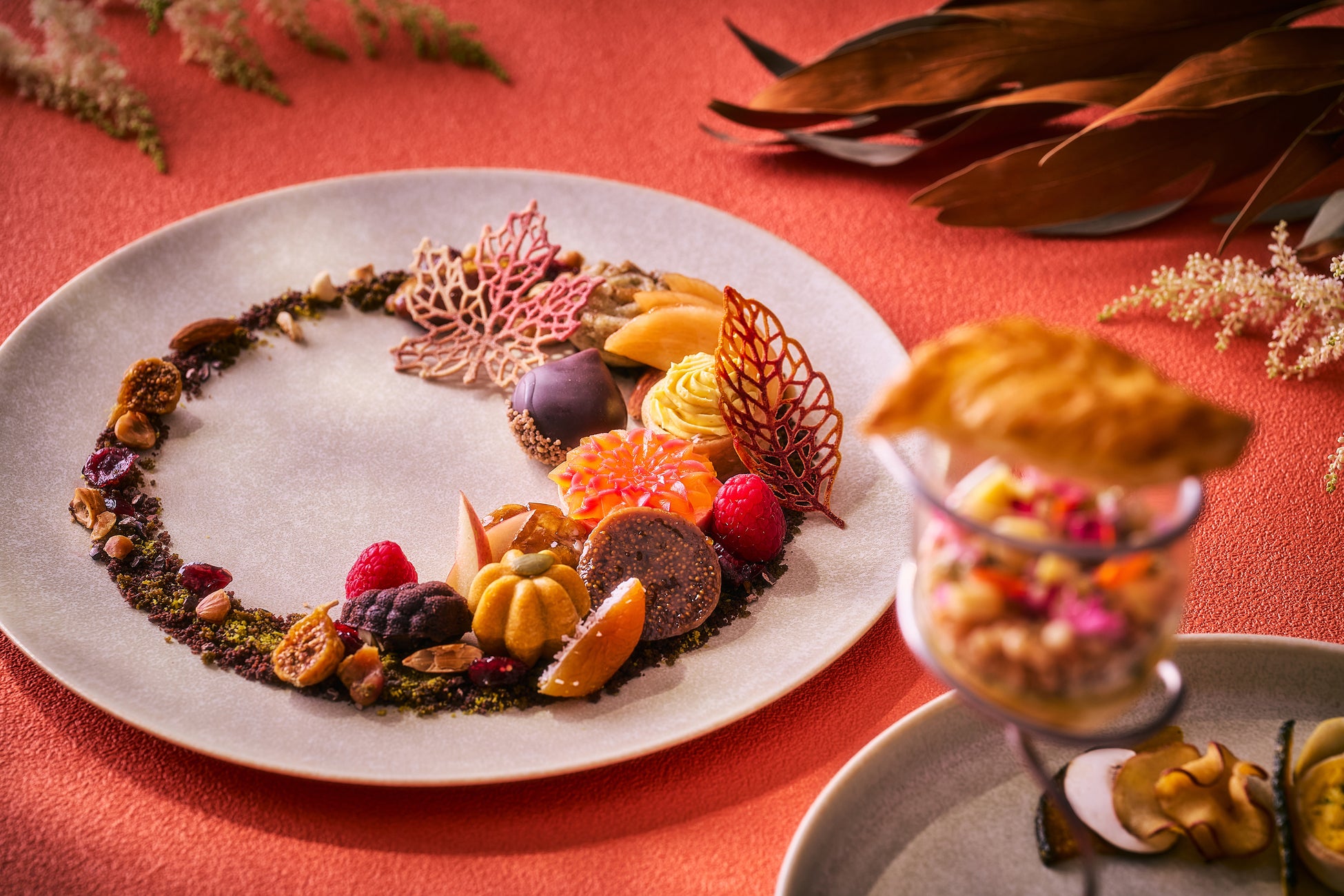 実り豊かな秋をテーマに描いたスイーツプレートには、オレンジのジュレで紅葉の美しさをデザインしたキャロットオレンジケーキや、かぼちゃのペーストにメープルを加えたプティパンプキン、さつまいもペーストにリーフを飾ったタルト、ココアや豆乳クリームにアーモンドの食感を加えた松ぼっくりのようなブラウニーなどをリースのように並べました。セイボリーは畑の収穫のように、グラスにかぼちゃのムースとトリュフの香りをまとわせた小さな粒状のパスタ フレーゴラや栗を重ねてリーフのパイを飾り、大豆ミートのキッシュや季節の野菜チップと共にお楽しみいただけます。