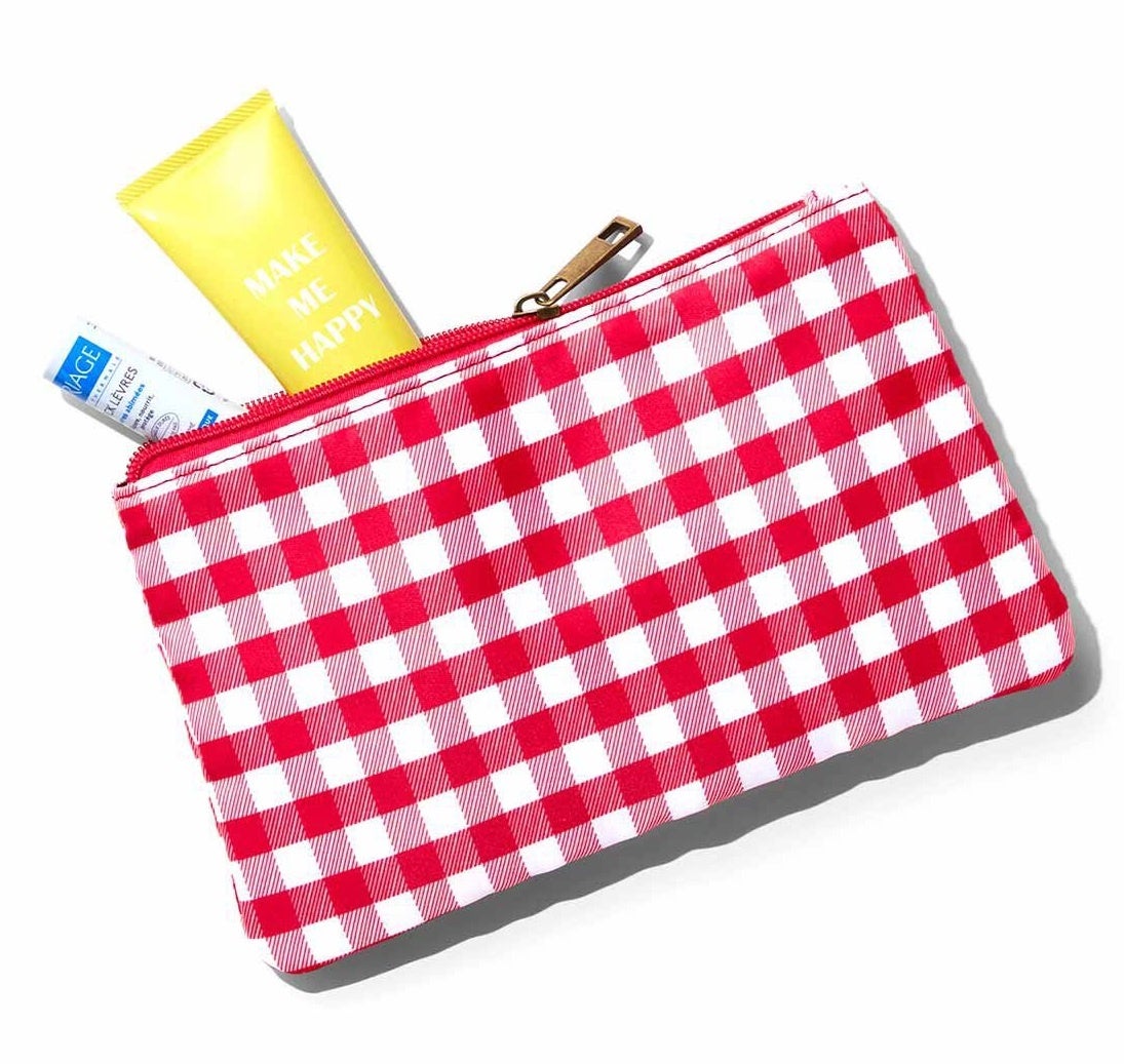 外ポケットにすっぽり収まるギンガムのポーチと、リボンモチーフのチャームがついています
