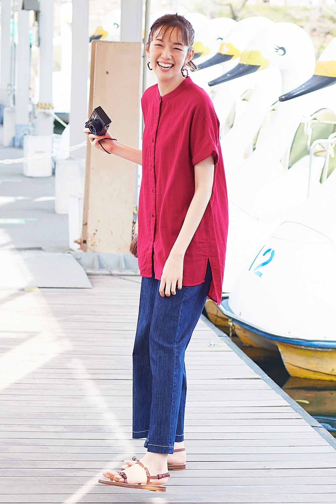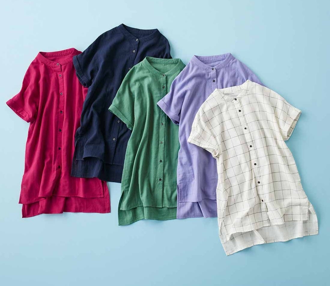 ダブルガーゼ素材を用いた、ビー玉のような彩り鮮やかなトップスです。体のラインを拾いにくいシルエットや、袖口と裾のデザイン、全開可能なボタンデザイン等、細見えする工夫と多様な着こなしが可能です。暑い日でも涼しく、気持ち良く、自分をより美しく見せるおしゃれを楽しむことができます。カラーは5色展開、好きなカラーでコーディネートを楽しめます。