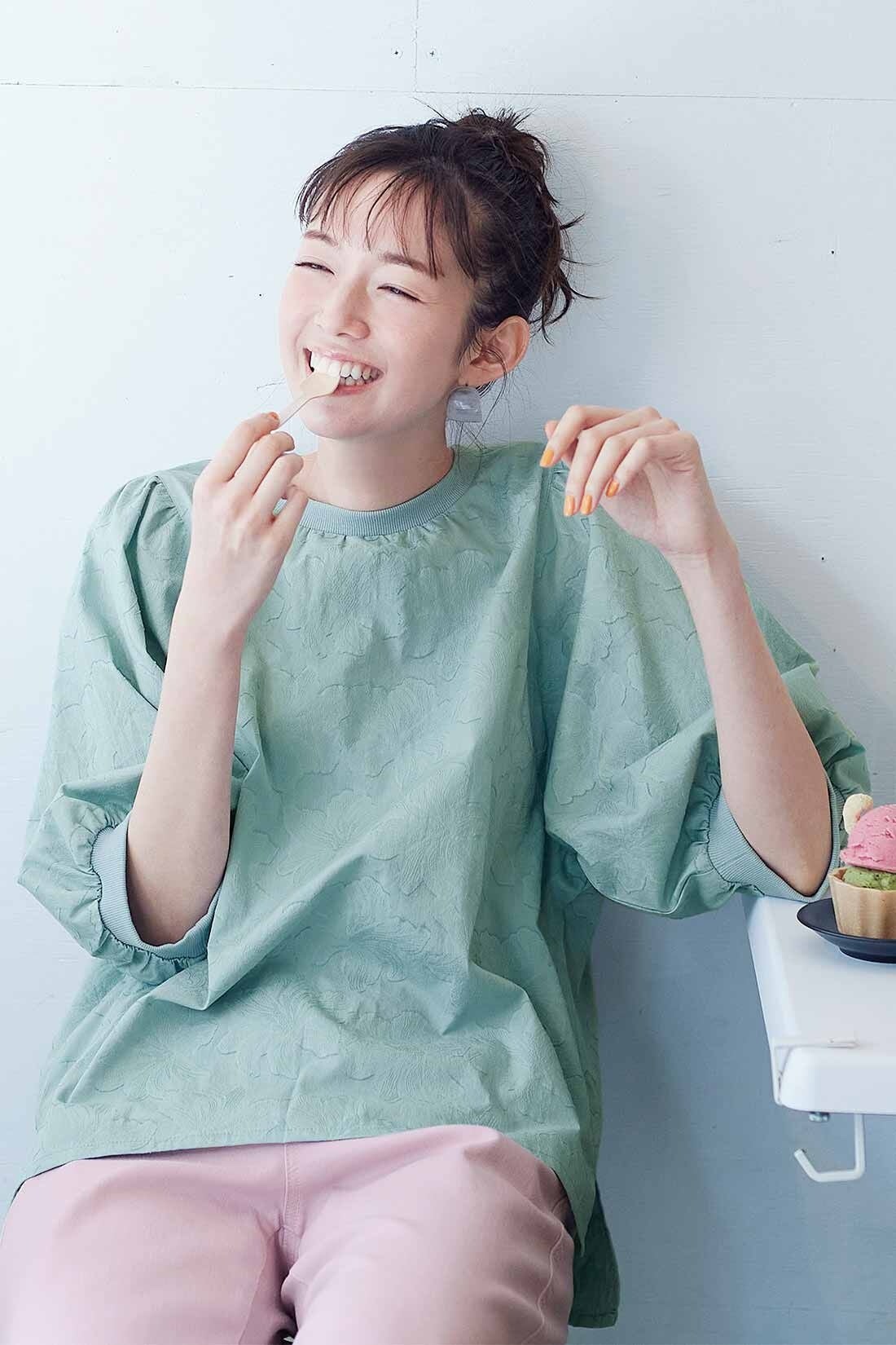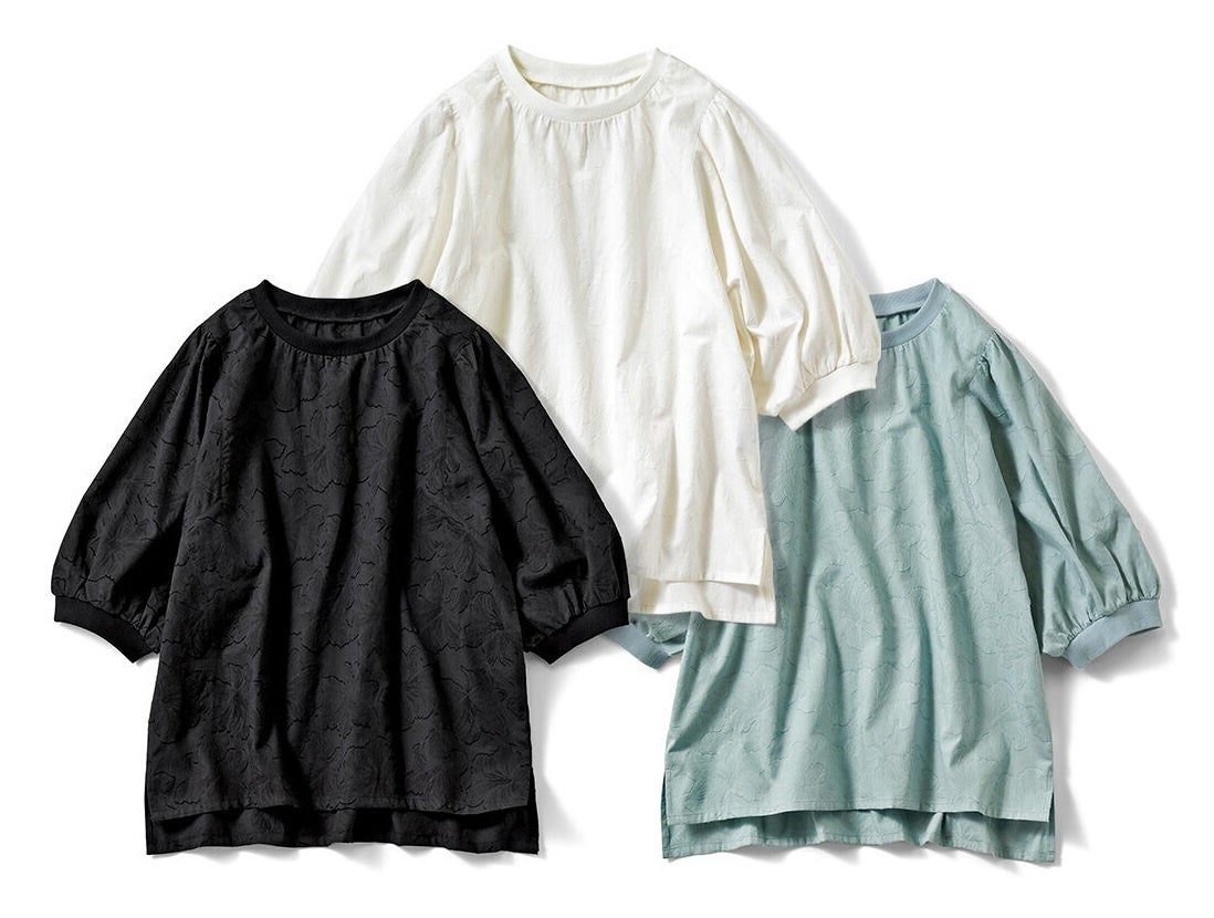 透け感と涼感のある、夏向けのジャカード織り綿100%トップスです。ゆったりとしたシルエット、二の腕カバーのぽんわり袖、着映えするジャガード柄の花模様、そしてネック部分と袖口の伸縮性のあるリブ仕様が特徴で、かわいく着ることができます。体形カバーと涼しさを一度に実現し、軽い着心地で、さらりと着るだけで一日を華やかに演出します。