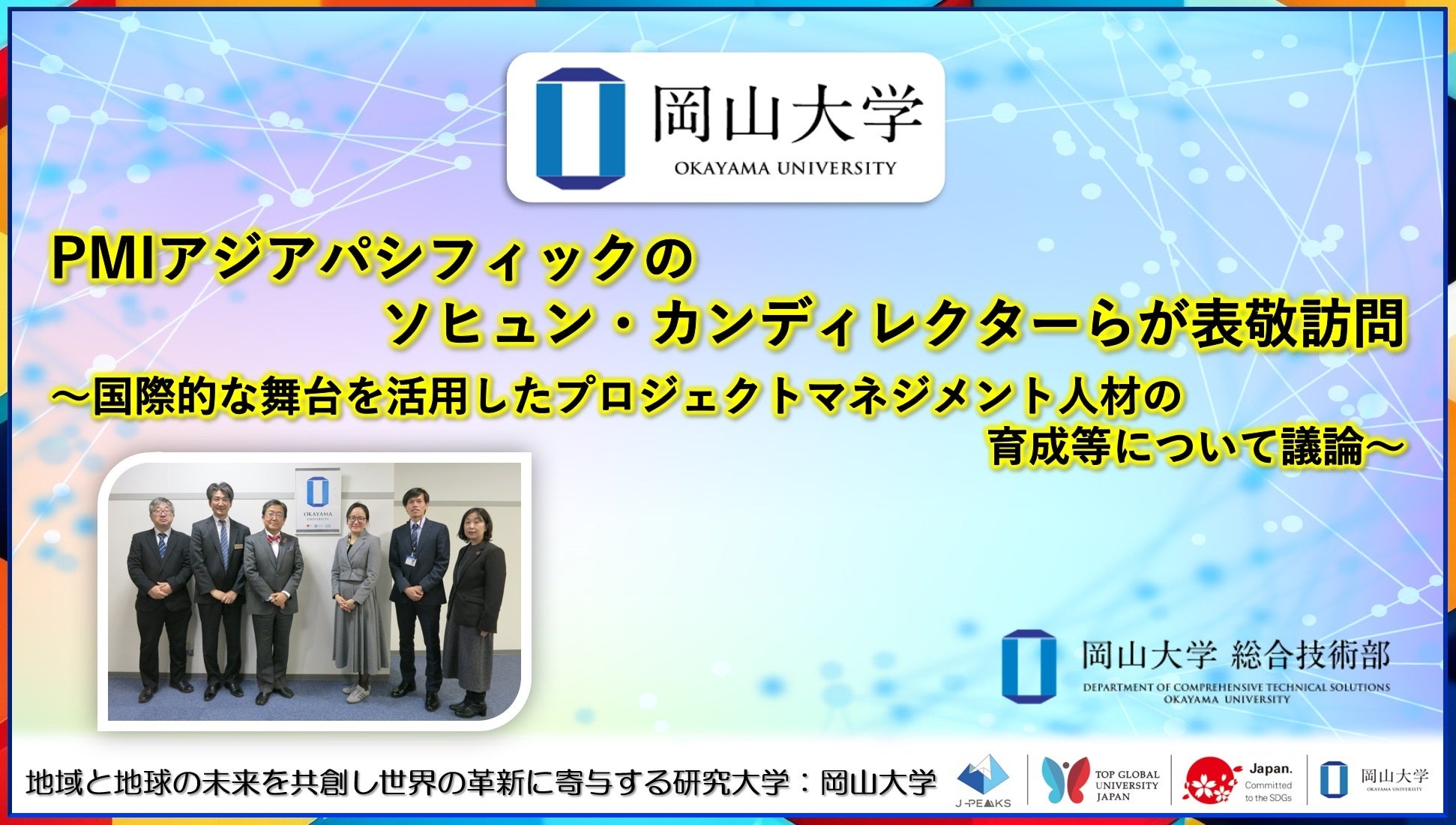 国立大学法人岡山大学(本部:岡山市北区、学長:那須保友)は、2025年3月14日、世界最大のプロジェクトマネジメント協会(Project Management Institute:PMI)のアジア太平洋地域リージョナルマネージングディレクターであるソヒュン・カン(SoHyun Kang)氏と同地域パートナーサクセスマネージャーの奥原修氏が本学を訪れ、那須保友学長を表敬訪問。本学からは総合技術部の堀格郎課長と中村有里技術専門職員、研究・イノベーション共創管理統括部の河本雅紀課長(当時)らが参加しました。