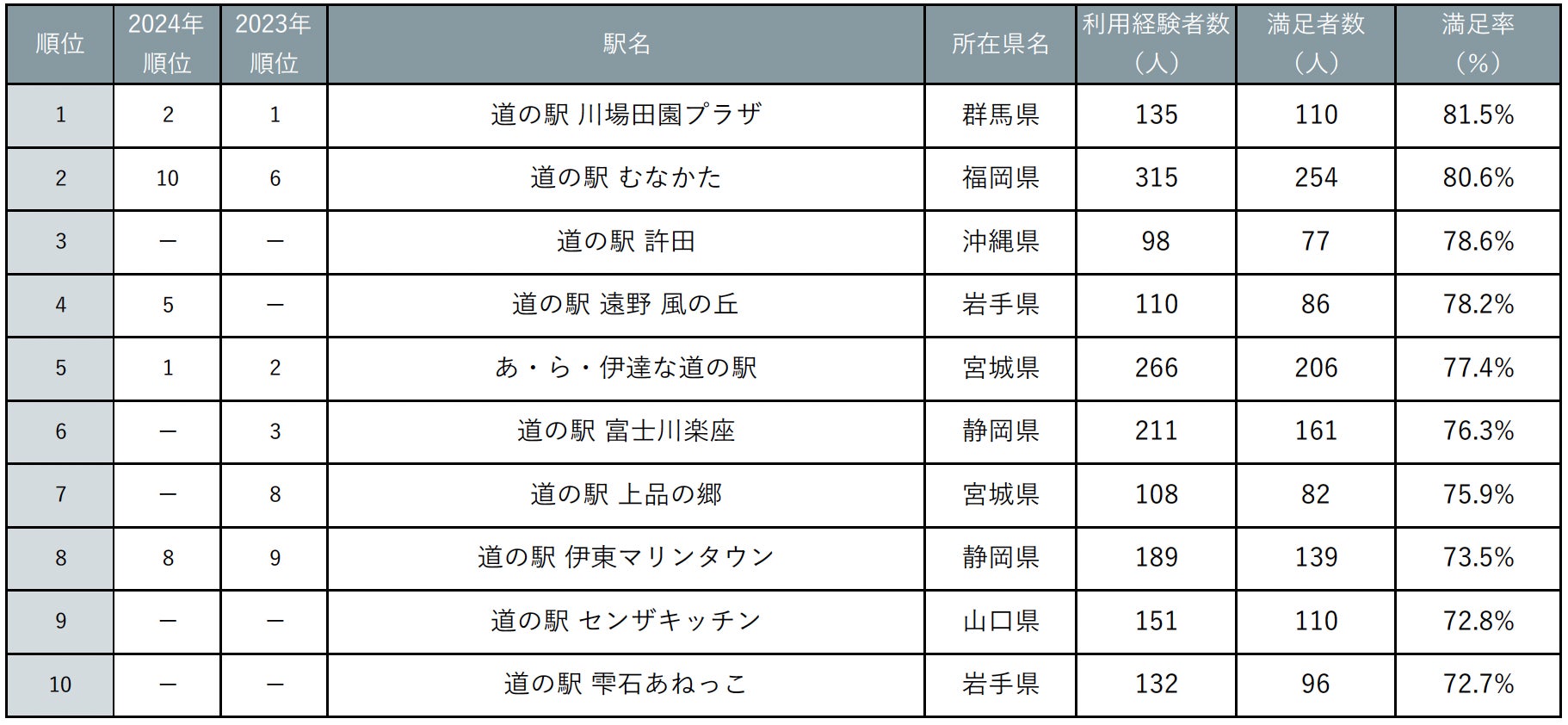 2025年2月28日時点で登録されている全国の全ての道の駅(1,230/未開業含む)の中から、2025年度の「満足度の高い道の駅」を選出するアンケート調査を実施しました。その結果、全国No.1に輝いたのは群馬県「道の駅 川場田園プラザ」で、昨年2位から見事首位に返り咲く結果となりました。広大な敷地に自然とバラエティ豊かなグルメ、アクティビティが充実した“1日遊べる道の駅”です。続く2位は福岡県「道の駅 むなかた」が昨年10位から大幅ジャンプアップ。旅の目的地へと進化がとまらない道の駅。付帯施設の充実や地域の魅力発信に磨きがかかるスポットも続々と登場しています。「もう一度利用したい道の駅ランキング」と「今後利用してみたい道の駅ランキング」(P3、P4)の結果もあわせてぜひチェックしてみてください。