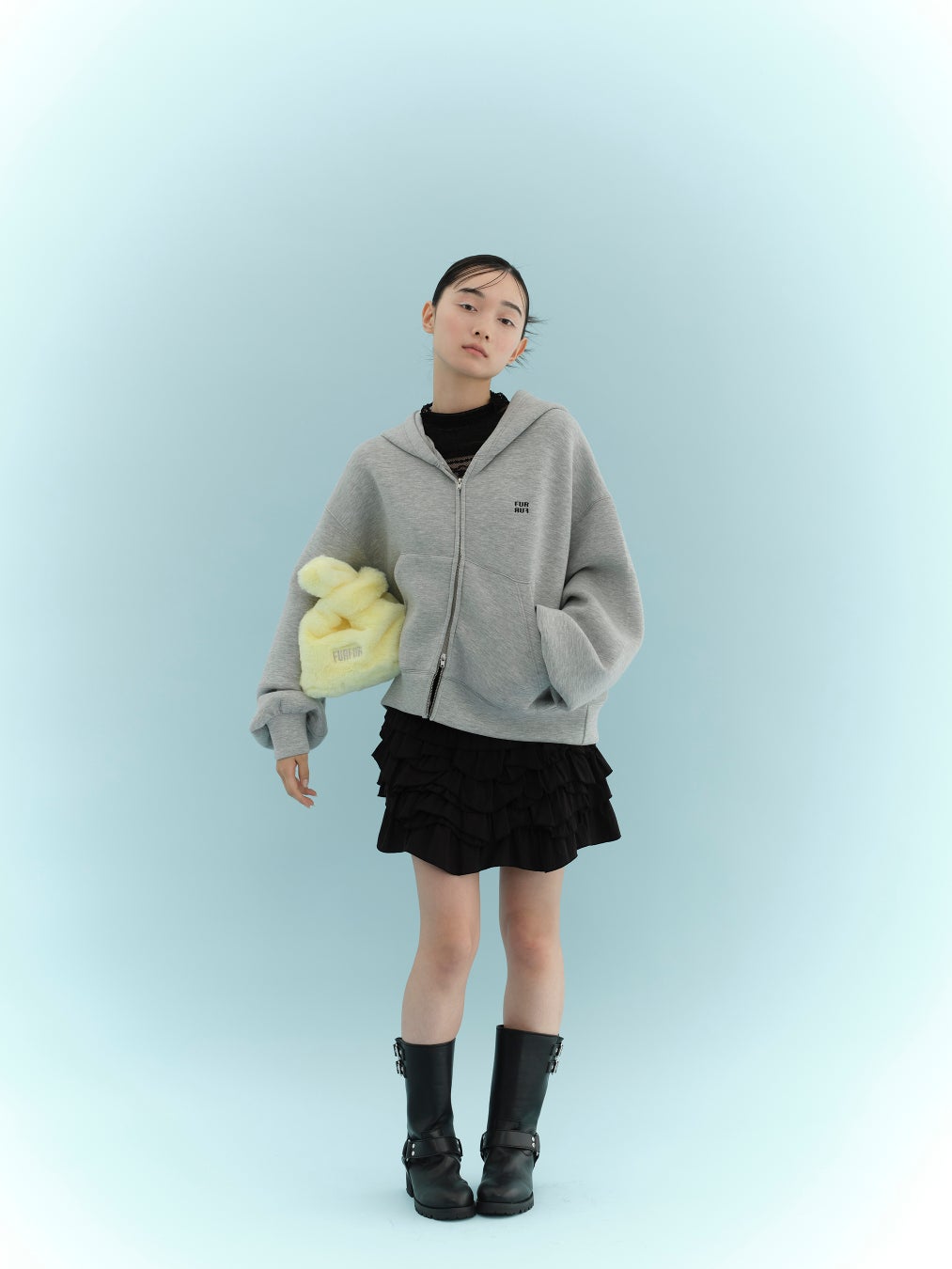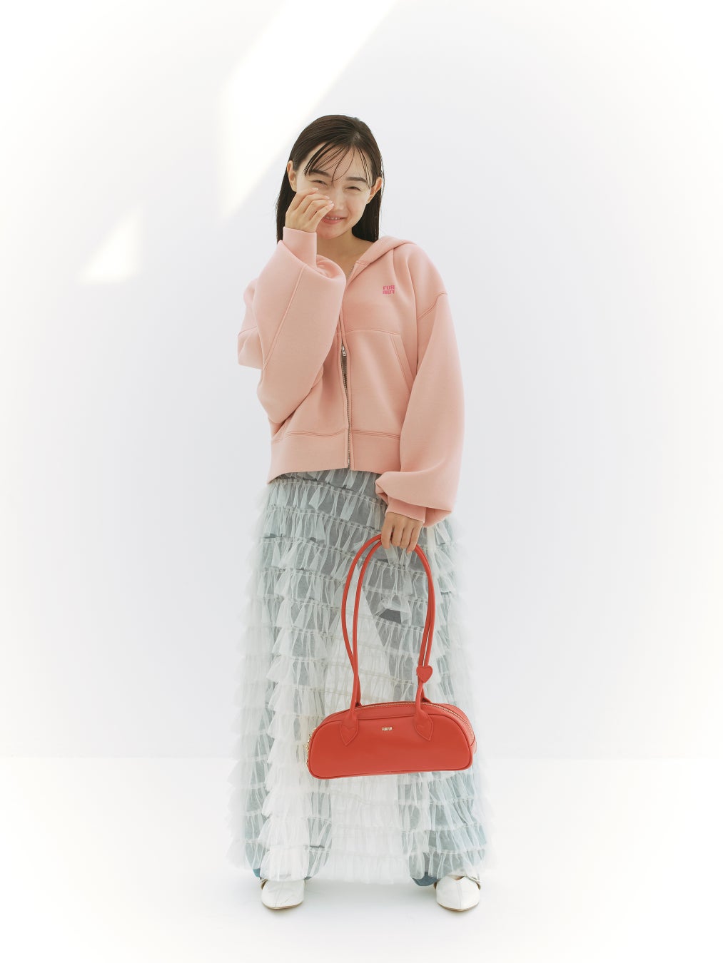 トップスはワイドなシルエットに大きめのフード、袖のボリューム感がこなれた印象に。